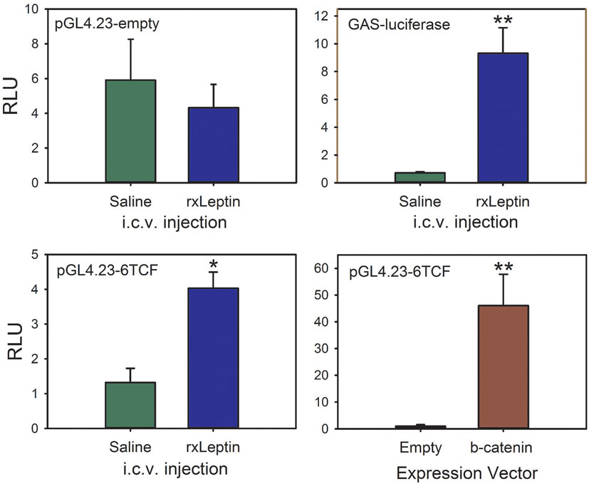 Figure 7. The canonical Wnt/β-catenin signaling pathway is activated by leptin signaling in Xenopus laevis tadpole brain. We injected plasmids into the region of the third ventricle of premetamorphic (NieuwkoopâFaber stage 50) tadpoles and transfected them by biopolar electroporation-mediate gene transfer. Twenty-four hours after transfection, we screened tadpoles for EGFP expression, and then separated them into eight groups. The reporter vector is given at the top left of each panel. Tadpoles received intracerebroventricular (i.c.v.) injections of 0.6% saline or recombinant Xenopus leptin (rxLeptin) (20 ng/g BW); a separate group was cotransfected with the pGL4.23-6TCF reporter vector and either empty expression vector (pCMVneo-empty) or a vector that expresses constitutively active β-catenin (pcDNA3-S33Y β-catenin). Two hours after i.c.v. injection, tadpoles were killed and brains harvested for dual-luciferase assay. Asterisks indicate statistically significant differences (*p < 0.001, **p < 0.0001; n = 8 tadpoles/treatment). |