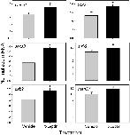 Figure 4. Validation of leptin-induced genes in NieuwkoopâFaber stage 54 Xenopus laevis tadpole preoptic area/hypothalamus by reverse transcriptase quantitative real-time PCR (RTqPCR). Tadpoles received an injection intracerebroventricular of 0.6% saline or recombinant Xenopus leptin (rxLeptin) (20 ng/g BW) and were killed 2 h later for tissue harvest for RNA isolation. Gene expression was analyzed by SYBR Green RTqPCR and normalized to the reference gene rpL8 which was not affected by rxLeptin injection (data not shown). Asterisks indicate statistically significant differences from saline injected controls (*p < 0.05; unpaired Studentâs t-test). |