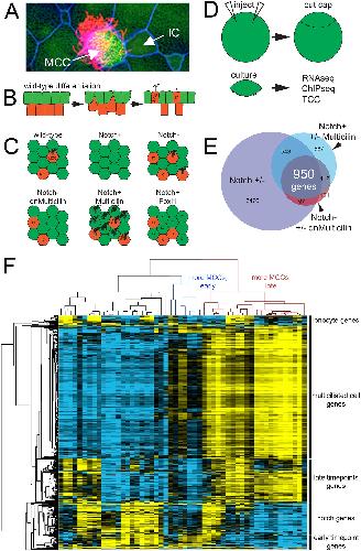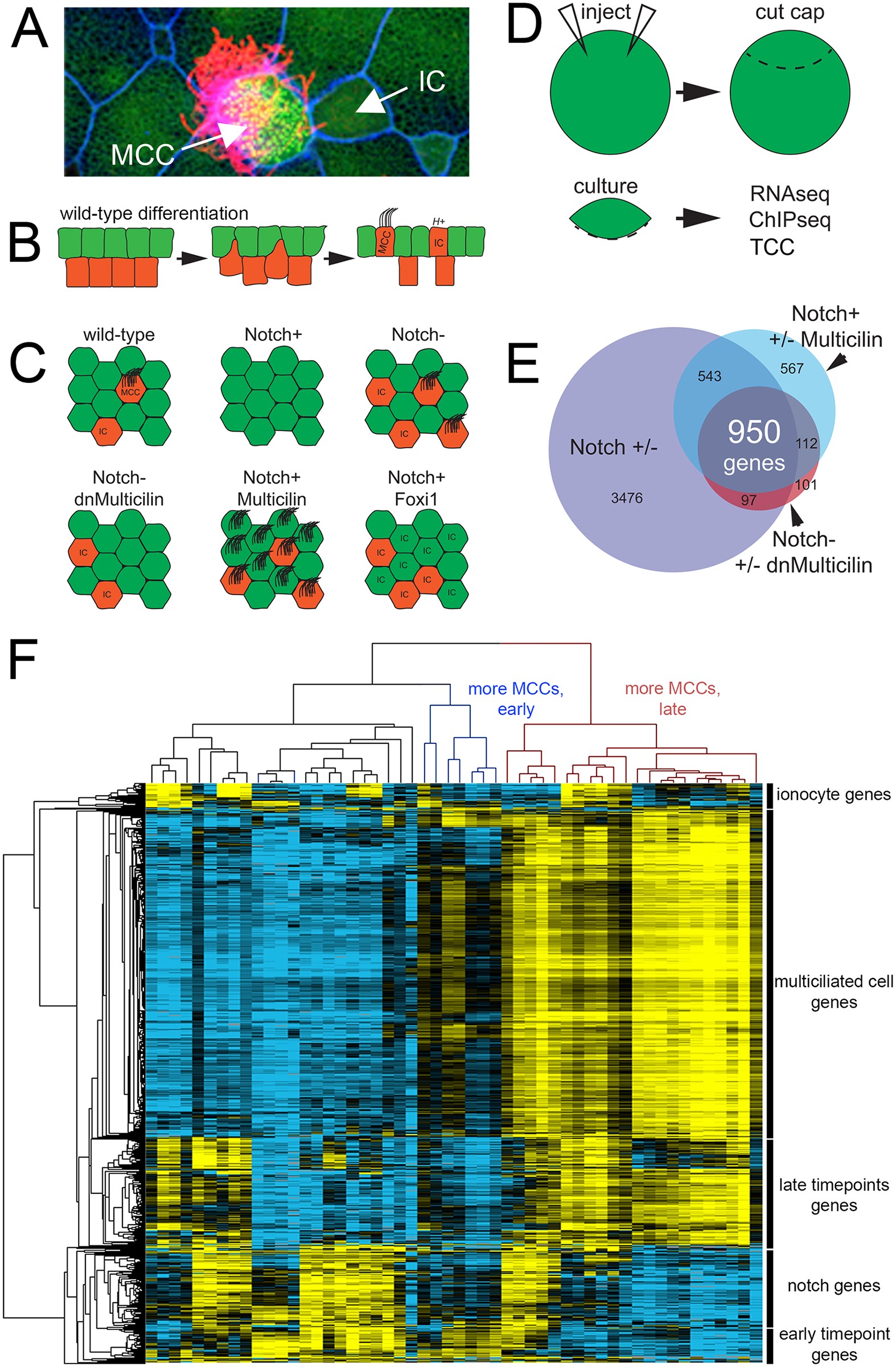 Identification of a MCC transcriptome (A) Confocal image of X. laevis skin showing a multiciliated cell (MCC), ionocytes (IC), and outer cells (green cells, unlabeled). (B) Differentiation of X. laevis skin. Multipotent progenitors are specified to become MCCs or ionocytes in the inner layer (red cells) by Notch signaling; they then intercalate into the layer of outer cells (green cells). (C) Diagrams illustrating how the numbers of MCCs and ICs in the skin change when Notch, Multicilin and/or Foxi1 activity is manipulated. (D) Schematic of the general experimental strategy used to analyze X. laevis epidermal progenitors (âcapâ), after manipulating gene expression using RNA injection. (E) Venn diagram using multiple RNAseq experiments to define a core list of genes expressed in MCCs based on an intersectional strategy. (F) Heatmap of transcriptional variation across all experimental conditions and timepoints subjected to RNAseq analysis (see Methods for more details). For clarity of display, sample names are omitted here but can be seen in S1 Fig.