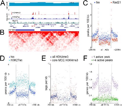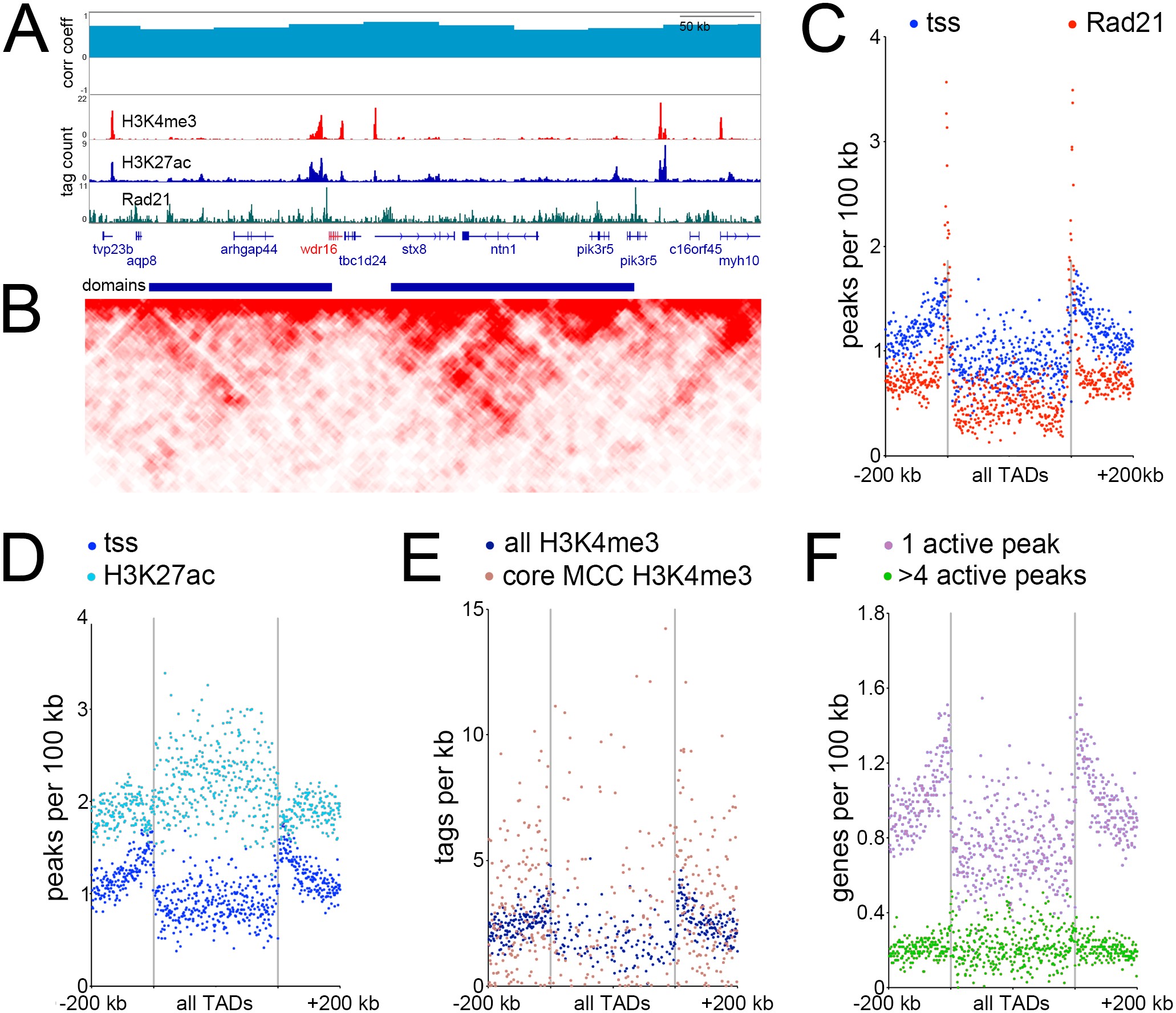 TADs and their genomic features (A) Browser screenshot of the genomic region surrounding wdr16, a MCC expressed gene. Top track is correlation coefficient between 3D chromosome conformation data between wild-type ectoderm and ectoderm injected with Multicilin, middle tracks show ChIPseq results as labeled, bottom track is called topological domains. (B) Interaction matrix of tethered conformation capture of the same genomic region. High-throughput methods of determining 3-dimensional chromatin structure such as TCC or HiC involve isolating DNA-protein complexes either via dilution (classical HiC), by fixing the proteins to avidin beads (TCC) or in situ nuclear fixation (in situ HiC), cutting DNA in this folded state with a restriction enzyme at many positions, religating, and sequencing. Restriction sites near loops of DNA will ligate across the loops at some frequency, which can then be used to reconstruct the frequency of contact between two close or distant regions of the genome. Here, regions interacting across the genome more often than a linear model of DNA would predict are shown, with darker red indicating a higher frequency of interactions.[6â9] (C-F) Metagene plots showing the distribution of various features relative to all TADs. All domains are normalized to the same size, the domain region is in the center of each plot, and the two vertical lines denote the domain boundaries. Areas in outer edges of the plot denote flanking genomic regions of some 200 kb. Each quartile of the plot (one quartile upstream, two quartiles inside the domain region itself, and one quartile downstream) is broken into 175 bins, and each dot denotes the measured values of one bin.