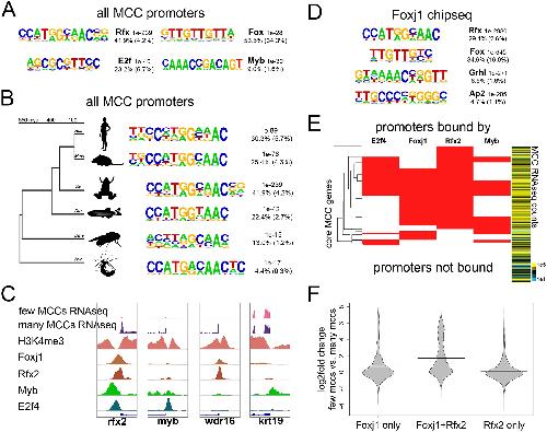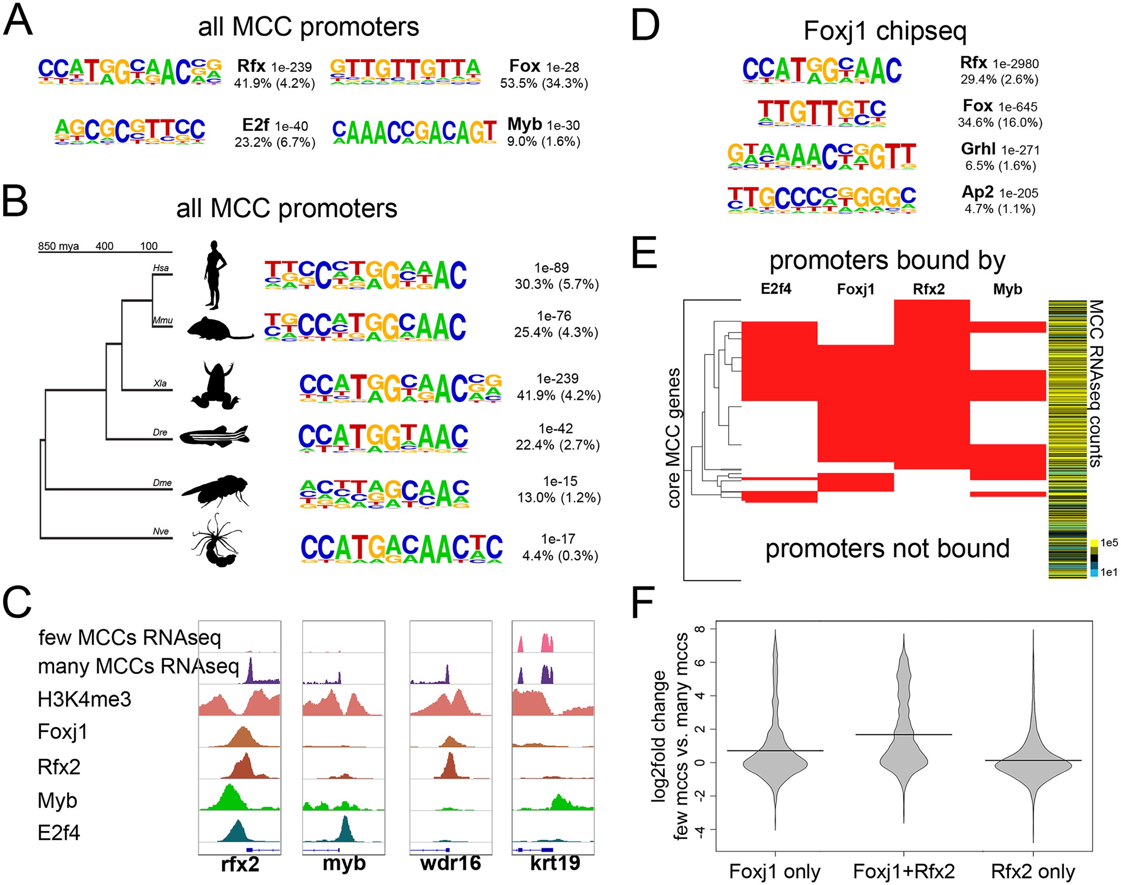 Transcription factor motifs and binding in MCCs (A) Top de novo motifs identified in all MCC promoters in X. laevis along with the transcription factor family that best matches the motif, a p-value determined by the cumulative hypergeometric distribution, the frequency of the motif in the promoters analyzed, and the background frequency of the motif in all promoters. (B) The top de novo motif as in (A) that were found in promoters of all MCC paralogs in the indicated species. Hsa, Homo sapiens; Mmu, Mus musculus; Xla, Xenopus laevis; Dre, Danio rerio; Dme, Drosophila melanogaster; Nve, Nematostella vectensis. (C) Example screenshots around the promoters of three genes that were upregulated during MCC differentiation and one that was not (krt19) indicating H3K4me3 or transcription factor binding by ChIPseq. These promoters were bound by various combinations of Foxj1, Rfx2, Myb, and E2f4 as shown. (D) Shown are the top de novo motifs that are associated with all called Foxj1 ChIPseq peaks. (E) Shown are all core 950 MCC promoters and the combinations of E2f4, Foxj1, Rfx2, and Myb bound to each. Heatmap to the right indicates normalized expression counts in manipulations producing many MCCs (epithelial progenitors injected with Notch-icd compared to those injected with Notch-icd and Multicilin). (F) Shown is the change in expression between epithelial progenitors with few MCCs (injected with Notch-icd) versus progenitors with many MCCs (injected with Notch-icd and Multicilin) driven by all promoters bound by the indicated factors.