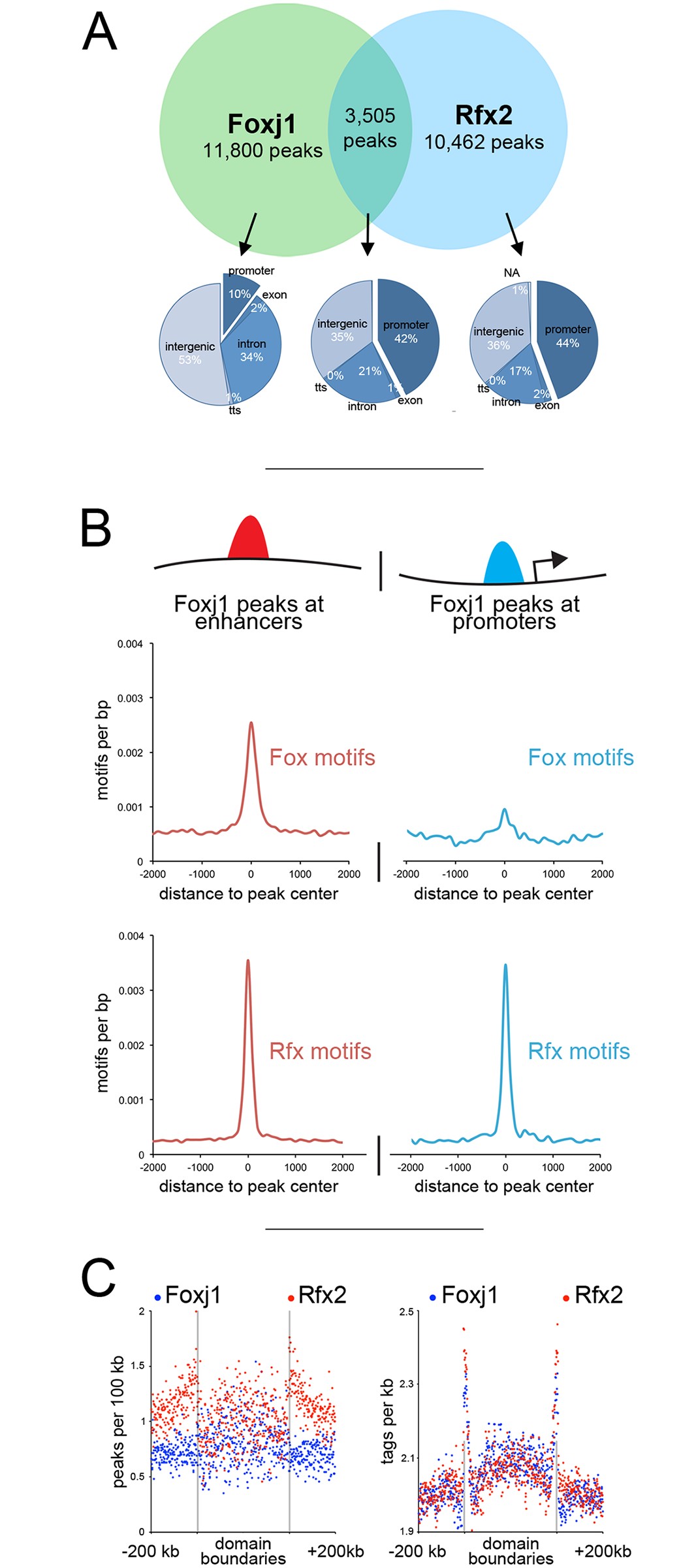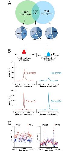 Interactions between Foxj1 and Rfx2 (A) Venn diagram at the top represents all peaks (fixed width) bound by Foxj1 and Rfx2 identified with ChIPseq, in terms of their overlap. The pie charts shown below illustrate where Foxj1 and Rfx2 binding occurs in relation to annotated genomic features depending on whether they bind together or alone. (B) Foxj1 ChIPseq peaks were subdivided into those located near promoters (< 1 kb to the TSS) or at more distal sites (> 1 kb to the TSS) and then analyzed for the frequency of Rfx or Fox binding motifs. (C) Shown is the distribution of Rfx2 and Foxj1 peaks relative to TAD boundaries (left panel), and the distribution of Rfx2 and Foxj1 sequencing tags relative to TAD boundaries (right panel).