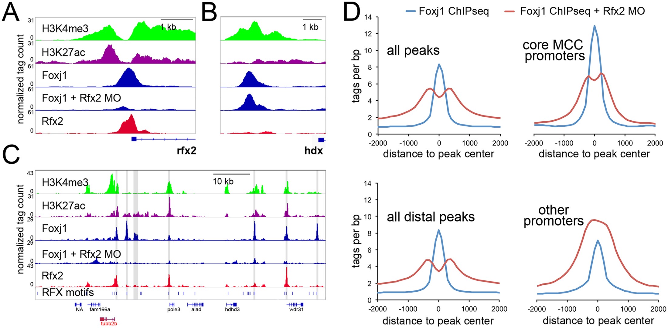 Binding of Foxj1 at promoters is dependent on Rfx2 (A-B) Screenshot around the promoter of X. laevis rfx2 (A) or hdx (B) along with the sequence tags obtained in ChIPseq of H3K4me3, H3K27ac, Foxj1, or Rfx2 in wildtype and Foxj1 in Rfx2 morphants (MO). (C) Shown is a screenshot of the X. laevis genomic region containing the tubb2b gene with ChIPseq tracks as in (A). The position of all Rfx motifs is denoted in the bottom track. Foxj1 peaks that are reduced >3-fold in the Rfx2 morphants compared to control are shaded. (D) Shown are sequencing tag histograms in peaks as labeled from ChIPseq of Foxj1 in wild-type progenitors or progenitors from Rfx2 morphants.