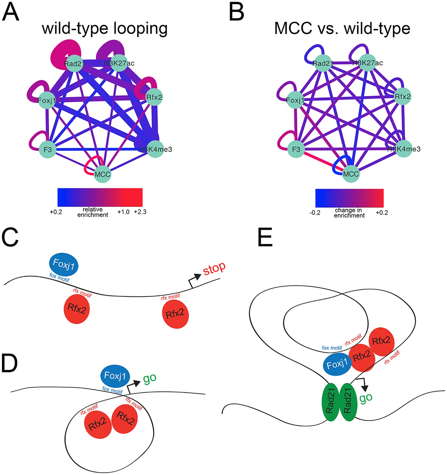 Chromatin loops connect MCC regulatory elements (A) The relative enrichment over expected of histone modifications or transcription factor binding sites at loop anchor points was calculated and visualized in Cytoscape. âWild-typeâ tissue is unmanipulated progenitors containing a mixture of outer cells, ionocytes, and multiciliated cells. Expected overlap was determined by hypergeometric distribution; 3D interactions were obtained from wild-type progenitors, and line thickness is inversely proportional to p value (range: 1e-37 to 1e-611, thicker line is lower p value). Nodes are as labeled; âF3â represents the subset of Foxj1 ChIPseq peaks that are reduced 3-fold or greater in Rfx2 knockdowns and âMCCâ represents MCC TSSâs. (B) 3D interactions were obtained for wild-type progenitors using progenitors injected with Multicilin to increase numbers of MCCs as background (to determine interactions stronger in wild-type tissue) and 3D interactions were also obtained using the reverse (to determine interactions stronger in multiciliated cells). Relative enrichments of histone modifications or transcription factor binding sites were determined for each as in (A) and then compared to one another. Thus, values here depicted by color represent changes in enrichment between the two conditions. (C,D) Model of recruitment of Foxj1-bound enhancers to MCC promoters via Rfx2 dimerization. (E) Model of how Rfx2-mediated enhancer recruitment operates in the context of TAD boundaries.