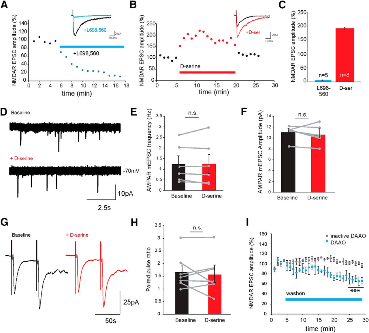 Reduced levels of d-serine lead to deficits in synaptic maturation. A, Example AMPAR mEPSC traces recorded from neurons in a control (top) and an animal injected intraventricularly with RgDAAO 24 h before recording (bottom). Average AMPAR mEPSC amplitudes (B) and (C) frequencies are reduced in animals treated with RgDAAO (blue), recorded 24 h after RgDAAO injection. Control animals were injected with heat-inactivated RgDAAO. *p < 0.05 (Mann–Whitney test). |