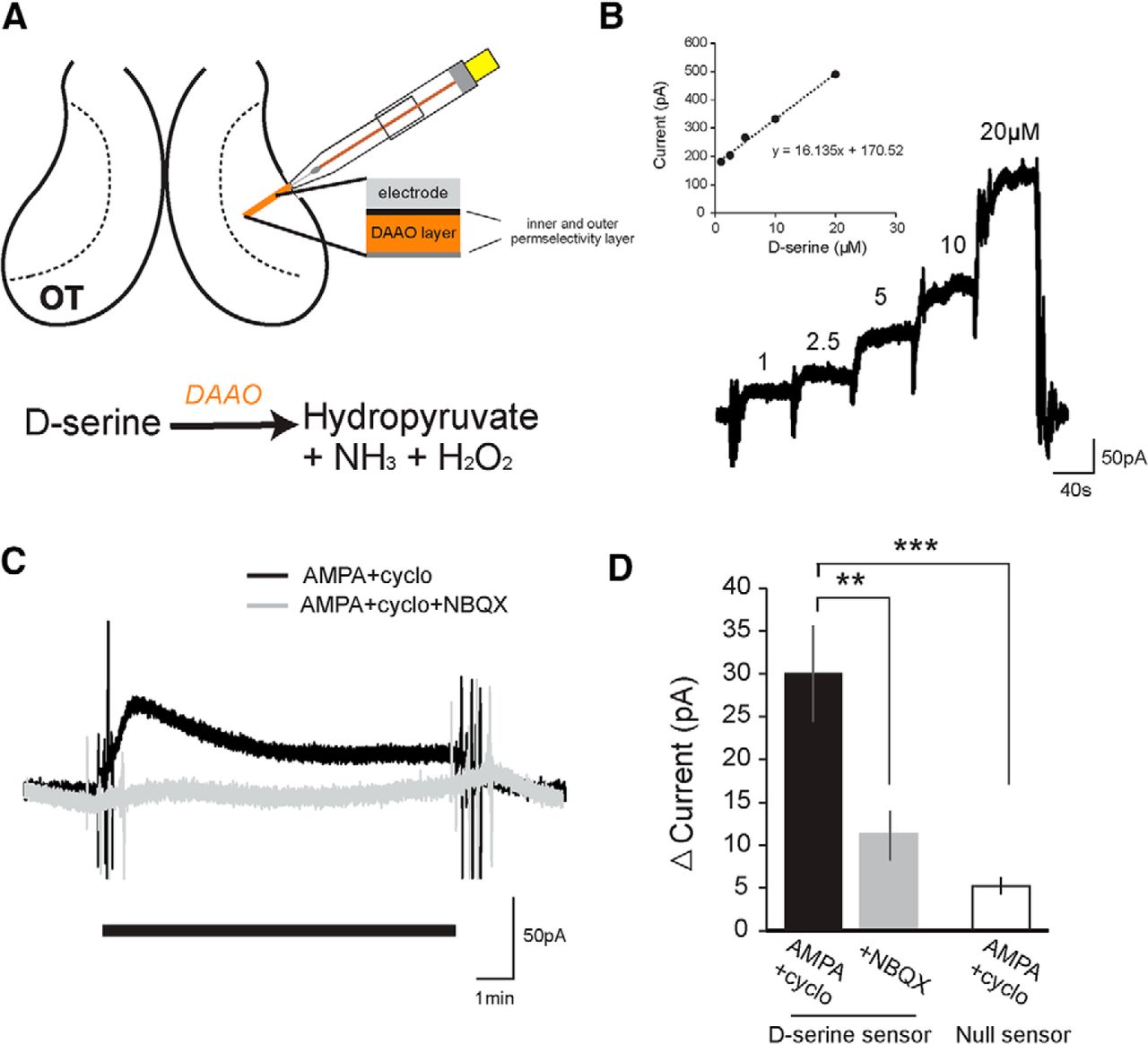 In situ detection of d-serine release in the optic tectum. A, Schematic of the placement of the d-serine biosensor into the neuropil of the optic tectum adjacent to the tectal cell body layer. d-Serine reacts with immobilized DAAO on the probe, degrading into hydroxypyruvate, ammonia, and hydrogen peroxide, which is oxidized at the biased platinum surface. B, Example calibration of biosensor with standard d-serine solutions (1, 2.5, 5 10, 20 μm) perfused into the recording chamber. Slope of the calibration curve for each experiment was used to calculate released d-serine concentrations. C, d-Serine release was stimulated by perfusing external solution containing AMPA (100 μm) with cyclothiazide (50 μm) to activate AMPARs and to block receptor desensitization, respectively. D, Average change in current detected by the d-serine or control null sensor during the last 2 min after wash-on of AMPA and cyclothiazide (black, d-serine sensor: n = 11; null sensor: n = 7) or AMPA, cyclothiazide, and NBQX (gray, d-serine sensor: n = 7). **p = 0.01, AMPA versus AMPA + NBQX (t test). ***p = 0.0015, AMPA versus null + AMPA (t test). |