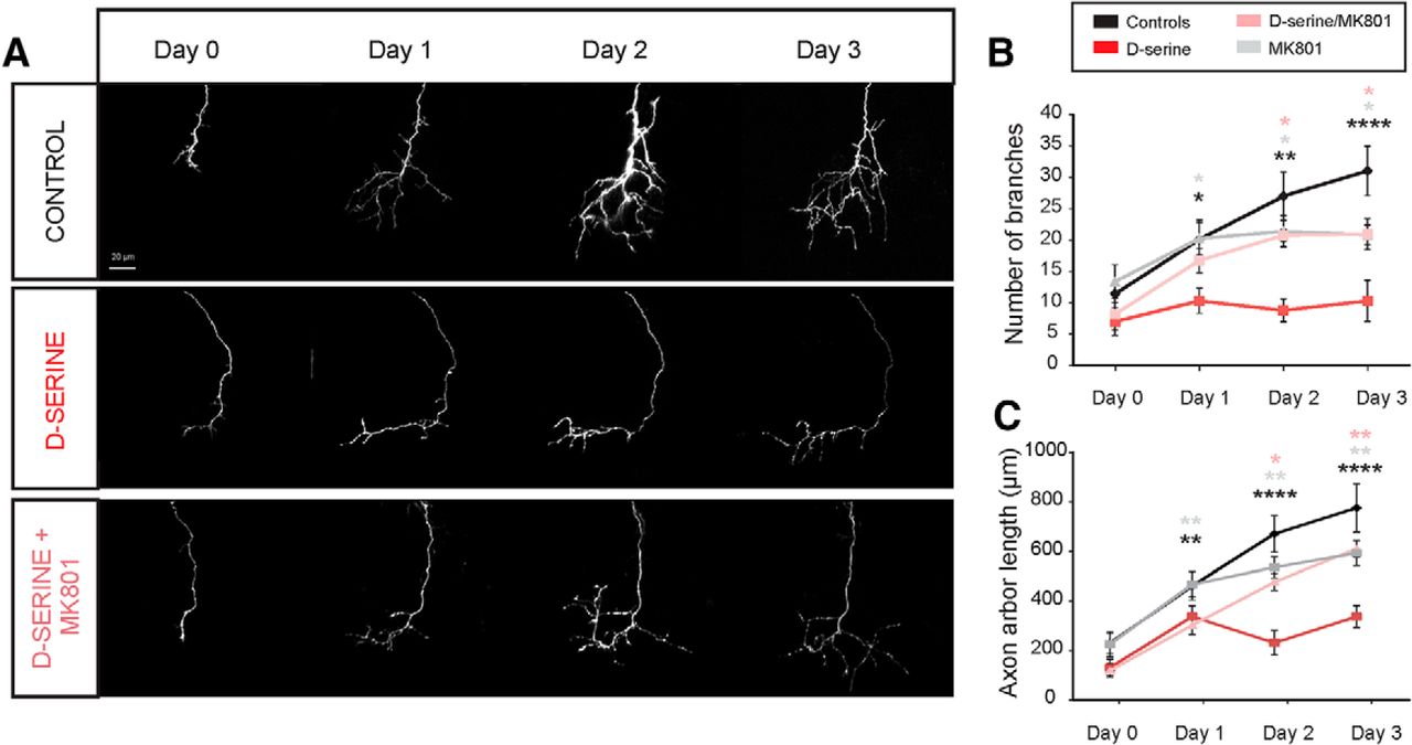 D-Serine results in reduced growth and branching of axonal arbors. Daily in vivo imaging of individual retinotectal axon arbors in animals electroporated to express EGFP in RGCs. Repeated imaging over 3 d of exposure to rearing solution containing d-serine (100 μm) and/or the NMDAR antagonist MK-801 (10 μm). A, Individual examples show greatly reduced growth and branching of d-serine-treated axons, which is rescued by NMDAR blockade. B, Number of branch tips and (C) total axonal arbor length for control tadpoles (n = 7), tadpoles raised in d-serine (n = 6), MK-801 (n = 5), and d-serine + MK-801 (n = 7). *p < 0.05, d-serine-treated versus other groups (two-way repeated-measures ANOVA with HolmâSidak post hoc test). ***p < 0.005, d-serine-treated versus all other groups (two-way repeated-measures ANOVA with HolmâSidak post hoc test). ****p < 0.0001, d-serine-treated versus all other groups (two-way repeated-measures ANOVA with HolmâSidak post hoc test). Black asterisk versus control. Gray asterisk versus MK-801. Pink asterisk versus d-serine + MK-801. |