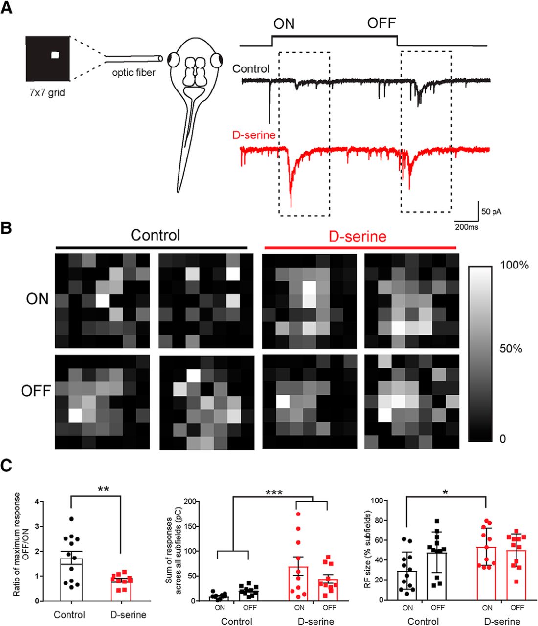 D-Serine increases receptive field size for ON responses. A, Schematic representation of the receptive field mapping setup. An optic fiber displaying a 7 Ã 7 grid of 49 individual subfields was aligned with the eye. Representative traces of whole-cell EPCSs recorded in the contralateral optic tectum in response to stimulus onset (ON) and stimulus offset (OFF) (control, black trace) (d-serine raised, red trace). B, Receptive field maps for tectal neurons in two example control cells and in two cells from animals raised in d-serine. Receptive fields were generated based on synaptic responses to bright ON stimulation in each subfield (top) and to the stimuli turning OFF (bottom) 1 s later. Receptive fields are plotted in grayscale. White represents the strongest subfield response. C, Left, Ratios of maximum CSC generated for an OFF response to the maximum CSC for an ON response show that the relatively stronger OFF response compared with the ON response consistently seen in control cells is equalized in d-serine cells (control, n = 12; d-serine, n = 10). **p < 0.001 (t test with one outlier removed by the ROUT outlier test). Middle, Sum of the CSCs evoked at all subfields is larger in animals raised in d-serine compared with control cells. ***p < 0.001 (two-way ANOVA, with Bonferroni post test; 3 cells removed by ROUT outlier test). Right, ON receptive fields are larger in animals raised in d-serine than in control animals. *p < 0.05 (two-way ANOVA with Bonferroni post test). |