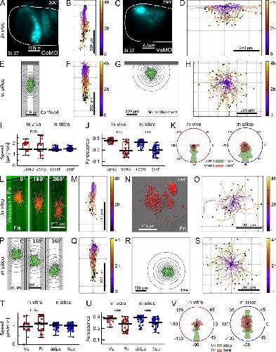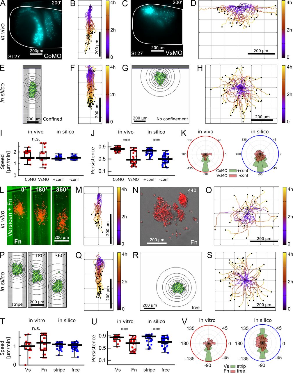 Figure 4. Confinement by versican enhances collective NC migration. (AâD) Lateral view of stage 27 embryos of wild-type NC (nuclear-GFP in cyan) transplanted into a CoMO-injected (A, n = 21) or VsMO-injected host (C, n = 24; Video 3), with cell trajectories (B and D). (EâH) In silico cell migration with and without confinement with cell trajectories (n = 50). (IâK) Comparison of cell speed, persistence, and direction of migration in vivo and in silico. (LâO) NC cluster migration in vitro. Frames of time-lapse movie of control NC cluster in versican confinement (L, green: versican, red: NC nuclei; n = 20) or without confinement (N; Video 2, n = 25) and cluster trajectories (M and O). (PâS) Simulations imitating the in vitro geometries (n = 50). (TâV) Comparison of cluster speed, persistence, and direction of migration in vitro and in silico. Error bars, minâmax, boxes: quartiles; bar, median. ***, P < 0.001; ns, not significant. |