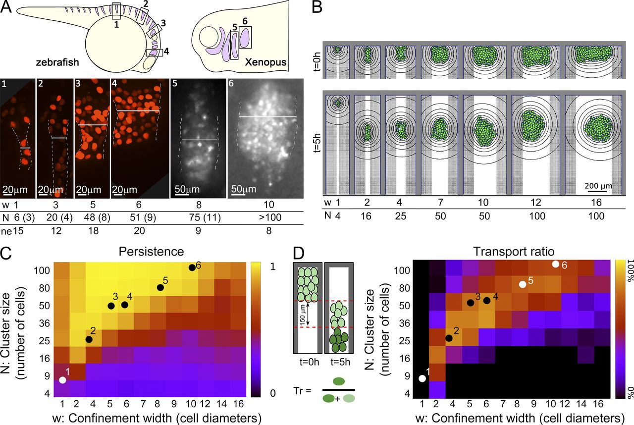 Figure 5. Effect of confinement width and cluster size. (A) Schematic illustration and examples of maximal projection of a Z-confocal stack used to measure the number of cells in NC streams of different widths. White line illustrates how the stream width was measured. Width (W) and number of cells (N) are shown at the bottom, with SD in parentheses; ne, number of embryos analyzed. (B) Snapshots of simulations with increasing confinement widths (w, cell diameters) and cluster size (N, number of cells). (C and D) Cluster persistences and transport ratio (percentage of cells in the cluster migrating at least 150 µm away from the clusterâs edge in 5 h). Heatmaps represent median values from n = 50 simulations. Dots show experimental values for NCs migrating in vivo in zebrafish and Xenopus embryos. Numbers on dots correspond to the same numbers shown in A. |