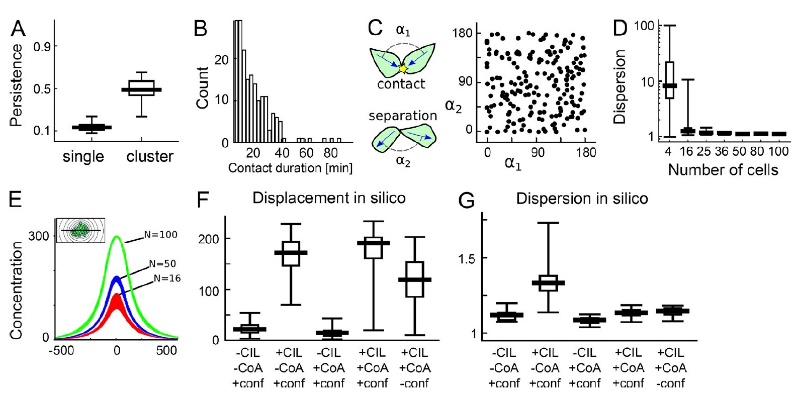 Figure S3. Computational model of NC cluster migration, related to Fig. 3. (AâE) Analysis of the NC migration model with CIL and CoA in unconstrained simulations. (A) NCC persistence in isolation and in cluster matching experimentally measured values 0.1 and 0.5 (Theveneau et al., 2010). (B) Duration of cellâcell contact in simulations of two-cell collisions. (C) Relative angle of velocities before and after two-cell collisions are largely uncorrelated, similar to previously reported experimental observations (Woods et al., 2014). (D) Cluster dispersion without confinement depends on cluster size. (E) Size dependence of dispersion is explained by lower levels of chemoattractant surrounding smaller clusters. Graph shows chemoattractant level profile along the cross section of 50 simulated clusters from simulations with n = 16, 50, and 100 cells each. (F) Net cluster displacements within 3 h. (G) Cluster dispersion over 10 h. Boxplots show median, quartiles as boxes, and minâmax values as error bars. |