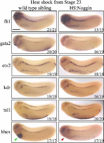 Fig. S5. BMP signaling is not required for GRN of the DH after stage 23. Hematopoietic programming in the DLP, at stage 26, following heat shock-induced noggin expression at stage 23. The expression of hemangioblast genes are unaffected in the DLP. The expression of hhex gene is absent in the liver primordium (red arrow) in HS:Noggin siblings compared with wild-type siblings (green arrow). Embryos were heat-shocked for 15 min at 35 °C at the stage 23 and were collected for analysis at stage 26. WISH was used to stain cells expressing genes that are essential for hematopoietic programming in the DLP; fli1, gata2, kdr, etv2, tal1, and lmo2 together with noggin transgene transcripts. HS:Noggin transgenic siblings were identified by the expression of Noggin transcripts (Uniform Fast Red staining in HS:Noggin embryos). |