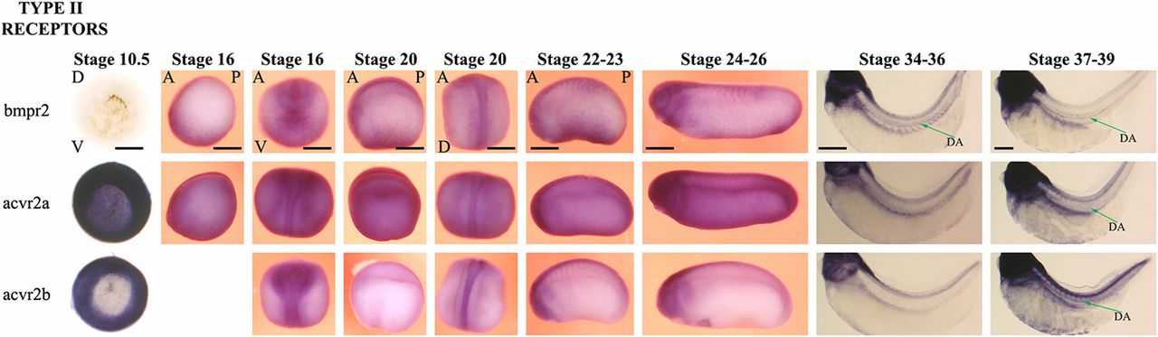 Fig. S1. BMP type II receptors. Type II receptors complement type I receptors and can potentially interact with any type I receptor with ligands being the determinant of the nature of heterocomplexes. Bmpr2 is not expressed at gastrulation, but its expression is activated in the ventral mesoderm from stage 16, later extending to almost all tissues. At stages 34â39, Bmpr2 is also expressed in the DA. Acvr2a is expressed ubiquitously at all stages analyzed. Acvr2b is expressed ubiquitously at gastrulation but later display a restricted expression pattern, being expressed predominantly in neurons. Acvr2b is localized to DA at stage 39. Embryos at stages 10.5 and 34â39 are cleared to enable visualization of the staining in deeper tissues. For stage 10.5 embryos, D indicates dorsal and V indicates the ventral side. For stages 16â20, embryos are visualized from dorsal (D) and ventral (V) angles, with anterior (A) at the top, except stage 16 bmp4 staining, which is documented from an anteriorâposterior (A-P) lateral view. From stage 21 onward, the pictures of embryos are taken from a lateral view, with anterior-posterior labeled where it is relevant, on the figure. |