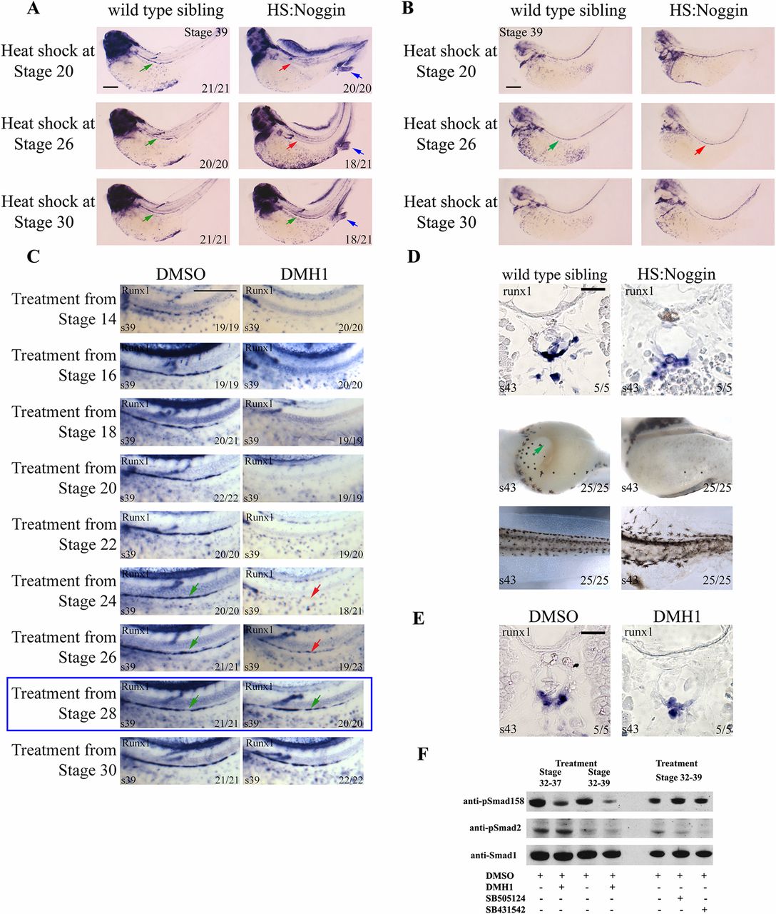 Fig. 2. BMP signaling is required for definitive and primitive hematopoiesis in Xenopus laevis. (A) Noggin protein induced by heat-shock treatment at stage 14 leads to a complete loss of tal1 and hba3 expression in ventral blood islands (arrows) in HS:Noggin transgenic Xenopus stage 32 embryos. Similarly, DMH1 treatment starting from stage 14 blocks tal1 and hba3 expression. (B) Inhibition of BMP signaling by DMH1 from stage 14 abrogates expression of myeloid blood markers mpo and spib at stage 33 compared with DMSO-treated control. (C and D) Inhibition of BMP signaling from stage 14 by Noggin (C) or DMH1 (D) results in the loss of expression of hemogenic endothelium markers runx1, spib, and gfi1a in the DA (red arrow for absence of in treated, green arrows for normal expression in control embryos). (E and F) The endothelium marker pecam1 and arterial gene dll4 is expressed in control as well as treated samples, albeit slightly lower in HS:Noggin embryos. The arterial marker efnb2 is severely reduced in either HS:Noggin-expressing or DMH1-treated embryos (red arrows in E and F). The stages at which the in situ hybridization was performed are indicated on the top left corner. Embryos were photographed from a lateral view, with anterior on the left and dorsal at the top. Numbers in bottom right corner indicate proportion of embryos displaying the phenotype. (Scale bars: 0.5 mm.) |