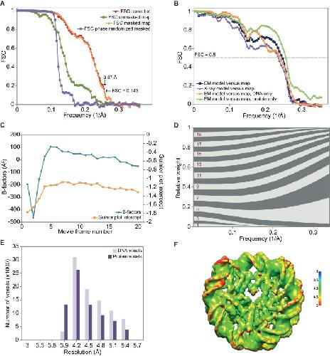 Figure 2. Data processing and map statistics. (A) Fourier Shell Correlation (FSC) plots for the EM density map. Arrows indicate 3.9 Å resolution estimate at FSC=0.143. A comparison of the FSC corrected (red), masked (orange), unmasked (green) and phase-randomized (purple) map is shown. (B) FSC of the EM map and atomic models derived from the X-ray structure (purple) and the refined model (dark blue) of the NCP, DNA alone (orange) and protein alone (green). (C) Per-movie-frame B-factors and Guinier plot intercepts. (D) Frequency-dependent weighting of movie frames (frame numbers in maroon). The contributions of early and late frames are down-weighted due to particle movement and beam damage. (E-F) Local resolution estimate in ResMap showing that the protein density is better refined as compared to the DNA density (also shown in B).