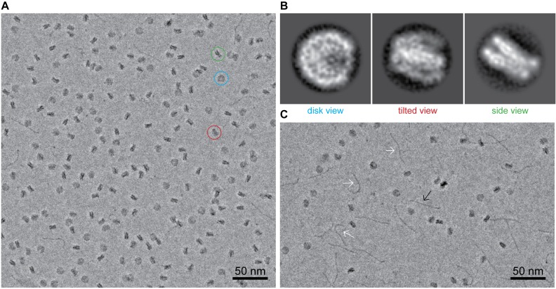 Figure 1. Phase-plate cryo-EM analysis of Nucleosome Core Particles (NCPs) in ice. (A and C) Field views of NCP particles recorded with the Volta phase plate. Representative views of the NCP circled in blue (disk view), in red (tilted view) and in green (side view). Arrows indicate excess DNA, in white (bent DNA) and in black (straight DNA). Scale bars are 50 nm. (B) Examples of reference-free 2D class averages showing representative disk, tilted and side views. Mask diameter is 12 nm.