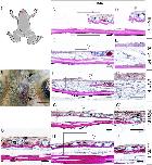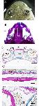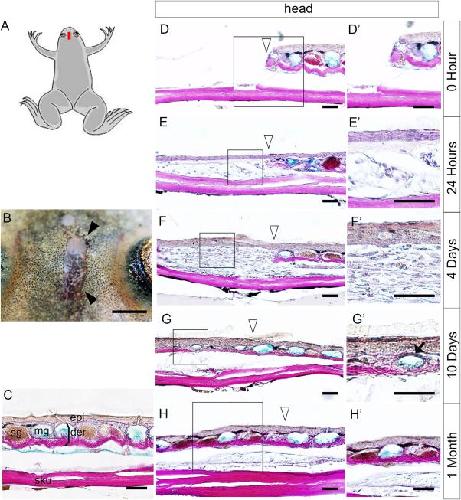 Head-skin regeneration and wound healing after excision. A: Illustration of a metamorphosed froglet; the red rectangle shows the excision location. B: The skin wound immediately after excision. C: A section of intact head skin, stained with Elastica van Gieson and Alcian blue. Epi, epidermis; der, dermis; mg, mucous gland; sg, serous gland; sku, skull (n = 4). D'–H': Magnified views of the rectangles in D–H. Time after excision: D, D', 0 hr (immediately after excision) (n = 3); E,E', 24 hr (n = 5); F,F', 4 days (n = 5); G,G', 10 days (n = 5); H,H', 1 month after excision (n = 4). Black arrowheads (B) indicate the wound site. Open arrowheads (D–H) indicate the right-hand border of the wound. Black arrow (G') indicates maturing secretion gland. B: Bar = 1 mm. C–H, D'–H': Bar = 50 µm.