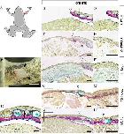 Cells derived from subcutaneous tissues contribute to skin regeneration. A: Illustration of a metamorphosed froglet indicating the transverse planes of sections shown as B-J and as E'-J'. Gray and red rectangles represent the grafted donor skin and excisional skin wound, respectively. B–D: Samples of intact skin regions were sectioned through the plane indicated by the dotted line as “B–D” in A. GFP-positive subcutaneous tissues were observed beneath the GFP-negative grafted skin. E–J: Samples of regenerating skin, including subcutaneous tissues, were sectioned through the plane indicated by the dotted line “E–J” at 2 or 3 weeks after skin excision. E–G: GFP-positive cells had accumulated underneath the GFP-negative wound epidermis at 2 weeks after skin injury (n = 4). Three of four individuals showed basically the same results. H–J: GFP-positive cells contributed to the regenerated skin, especially to the dermis in the center of the wound (n = 4). Four of four individuals showed basically the same results. Asterisks indicate secretion glands. White arrowheads (E–G) indicate the right-hand border of the wound. Pairs of white arrowheads (H–J) indicate the left- and right-hand borders of the wound. Open arrowheads indicate GFP-negative cells contributing to the dermis of the regenerating skin. Bar = 100 µm.