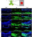 The prx1 enhancer was activated in all trunk, forelimb, and head-skin wound areas 4 days after skin excision in Mprx1-GFP froglets. Sections of regenerating and intact control skin were labeled with an anti-GFP antibody; nuclei were stained with DAPI. Immunostaining of regenerating skin around the original wound area (A,B,E,F,I,J) and intact (control) skin away from the wound area (C,D,G,H,K,L) in the same froglet. Little GFP was detected in the intact control skin (D,H,L), but robust staining for GFP was detected under the wound epidermis (B,F,J). Skin surface is up. Five of five and four of four individuals showed basically the same results in the trunk and forelimb, respectively. Two of four individuals showed robust staining for GFP in wound area of the head (J), but the rest showed relatively weaker staining for GFP. Bar = 100 µm.