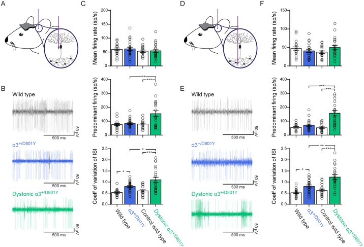 Mutations in the neuron-specific α3 isoform of the Na+/K+-ATPase are found in patients suffering from Rapid onset Dystonia Parkinsonism and Alternating Hemiplegia of Childhood, two closely related movement disorders. We show that mice harboring a heterozygous hot spot disease mutation, D801Y (α3+/D801Y), suffer abrupt hypothermia-induced dystonia identified by electromyographic recordings. Single-neuron in vivo recordings in awake α3+/D801Y mice revealed irregular firing of Purkinje cells and their synaptic targets, the deep cerebellar nuclei neurons, which was further exacerbated during dystonia and evolved into abnormal high-frequency burst-like firing. Biophysically, we show that the D-to-Y mutation abolished pump-mediated Na+/K+ exchange, but allowed the pumps to bind Na+ and become phosphorylated. These findings implicate aberrant cerebellar activity in α3 isoform-related dystonia and add to the functional understanding of the scarce and severe mutations in the α3 isoform Na+/K+-ATPase.