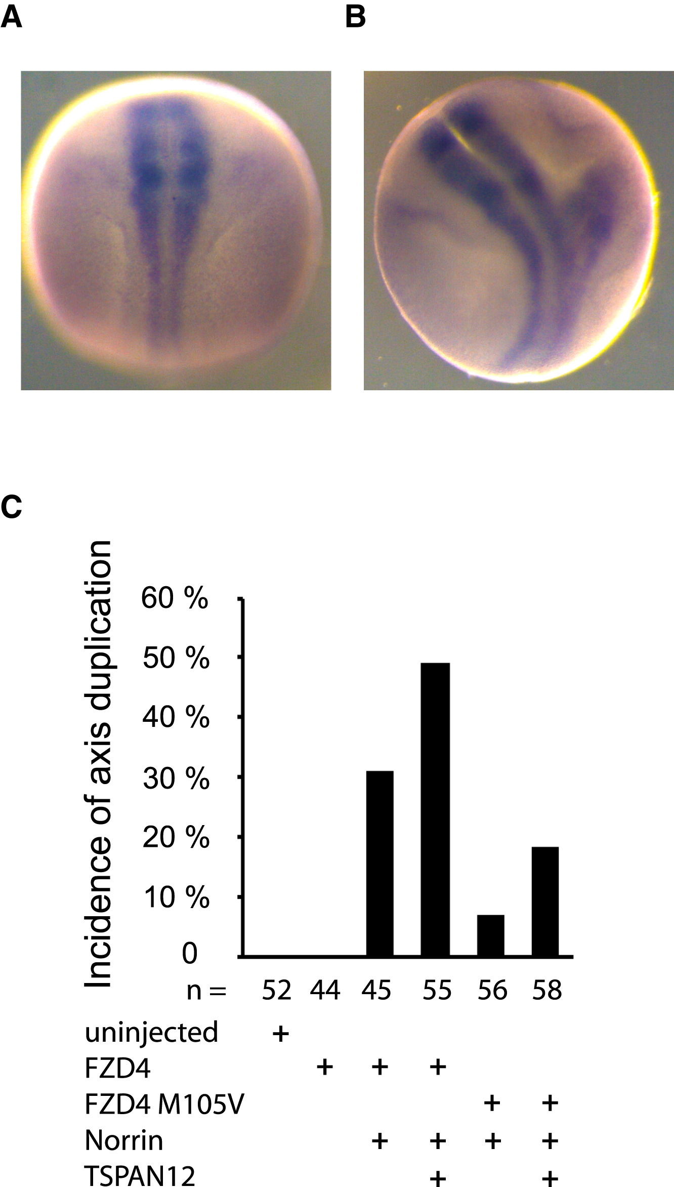 (C) 44â58 embryos per group were analyzed. Two independent experiments showed very similar results. Co-injection of hTSPAN12 RNA increases the incidence of axis duplication in hFZD4- and hFZD4 M105V-expressing embryos.