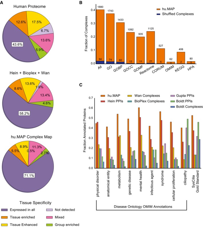 Macromolecular protein complexes carry out many of the essential functions of cells, and many genetic diseases arise from disrupting the functions of such complexes. Currently, there is great interest in defining the complete set of human protein complexes, but recent published maps lack comprehensive coverage. Here, through the synthesis of over 9,000 published mass spectrometry experiments, we present hu.MAP, the most comprehensive and accurate human protein complex map to date, containing > 4,600 total complexes, > 7,700 proteins, and > 56,000 unique interactions, including thousands of confident protein interactions not identified by the original publications. hu.MAP accurately recapitulates known complexes withheld from the learning procedure, which was optimized with the aid of a new quantitative metric (k-cliques) for comparing sets of sets. The vast majority of complexes in our map are significantly enriched with literature annotations, and the map overall shows improved coverage of many disease-associated proteins, as we describe in detail for ciliopathies. Using hu.MAP, we predicted and experimentally validated candidate ciliopathy disease genes in vivo in a model vertebrate, discovering CCDC138, WDR90, and KIAA1328 to be new cilia basal body/centriolar satellite proteins, and identifying ANKRD55 as a novel member of the intraflagellar transport machinery. By offering significant improvements to the accuracy and coverage of human protein complexes, hu.MAP (http://proteincomplexes.org) serves as a valuable resource for better understanding the core cellular functions of human proteins and helping to determine mechanistic foundations of human disease.