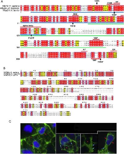 Fig. 1. Amino acid sequence alignments of Xenopus Wbp2nl to human WBP2 and WBP2NL. (A)Xenopus Wbp2nl (NP_001088037.1 [laevis] and NP_001107397.1 [tropicalis]) is highly similar to human WBP2 (NP_036610.2). Blue bar indicates the predicted PH-G domain and green bar indicates the predicted WWbp domain. Highly conserved motifs and α-helix are indicated by red bars. Five single amino acid mutations that were experimentally tested for function are indicated by black arrows (T45A, Y55F, Y91G, F127P, Y282F). AP, adaptor protein complex; ER, endoplasmic reticulum retention signal; ITSM, immunoreceptor tyrosine-based switch motif; SH2, Scr Homology domain 2; YAP, Yes associated protein binding motif. (B) Comparison of human WBP2NL (AAH22546.1) to Xenopus sequences shows large regions of disimilarity. Another human WBP2NL entry (Q6ICG8.1) is identical to AAH22546.1 except there is a glutamine at position 285 instead of a histidine. (C) Four examples of cells immunostained for Myc-Wbp2nl (green). Nuclei are stained with DAPI (blue). Note that staining is perinuclear (red arrows), and in cytoplasmic tubular structures (blue arrows) consistent with affiliation with Endoplasmic reticulum. Red asterisks denote intracellular yolk platelets. |
