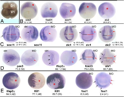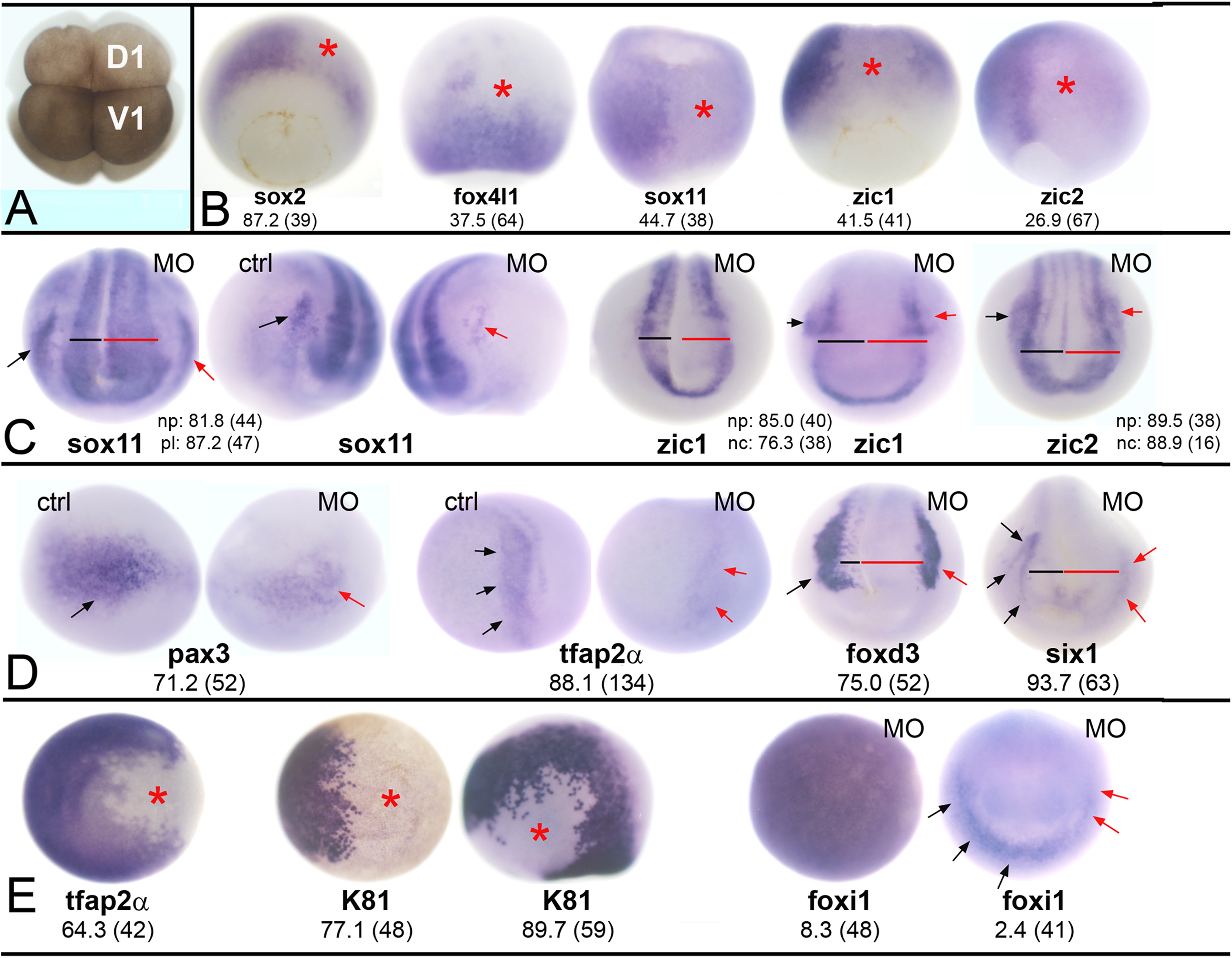 Fig. 2. Reduction of Wbp2nl affects ectodermal tissues. (A) An 8-cell Xenopus laevis embryo. The dorsal-animal blastomere (D1) gives rise to the neural plate and the ventral-animal blastomere (V1) gives rise to the epidermis. Border zone derivatives (neural crest and cranial placodes) descend from the lateral regions of both blastomeres (Moody and Kline, 1990). (B) Knock-down of Wbp2nl causes a decrease in the expression (loss of blue reaction product) of neural ectodermal genes on the MO-injected side (asterisk) of gastrula stage embryos. sox2 is a vegetal view with dorsal to the top; the rest are dorsal views with animal to the top. (C) By neural plate stages, neural gene domains are expanded; compare the width of the neural plate on MO-injected side (red bar) to control side (black bar). (See also D). The PPE domains of sox11 and the neural crest domains of zic1 and zic2 are reduced on MO-injected sides (red arrows) compared to control sides (black arrows). Anterior views with dorsal to the top. (D) At neural plate stages, neural crest markers (pax3, tfap2α, foxd3) and an early PPE marker (six1) are reduced on the MO-injected side (red arrows) compared to control sides (black arrows). Also note wider neural plates (red bars). pax3 and tfap2α are anterior-side views; foxd3 and six1 are anterior views. (E) Two epidermal genes are reduced at the sites of Wbp2nl knock-down (asterisks) at gastrula (tfap2α, K81 right image; both are animal pole views) and neural plate (K81 left image; side view with dorsal to top and anterior to right) stages. In contrast, the animal pole expression of foxi1 in the gastrula (left image) is not altered. Rarely, the PPE expression of foxi1 (right image; anterior view with dorsal to top) is reduced (red arrows) after Wbp2nl knock-down. Frequencies of the phenotypes and sample sizes (n) are given in each panel. |