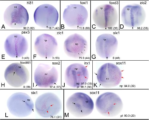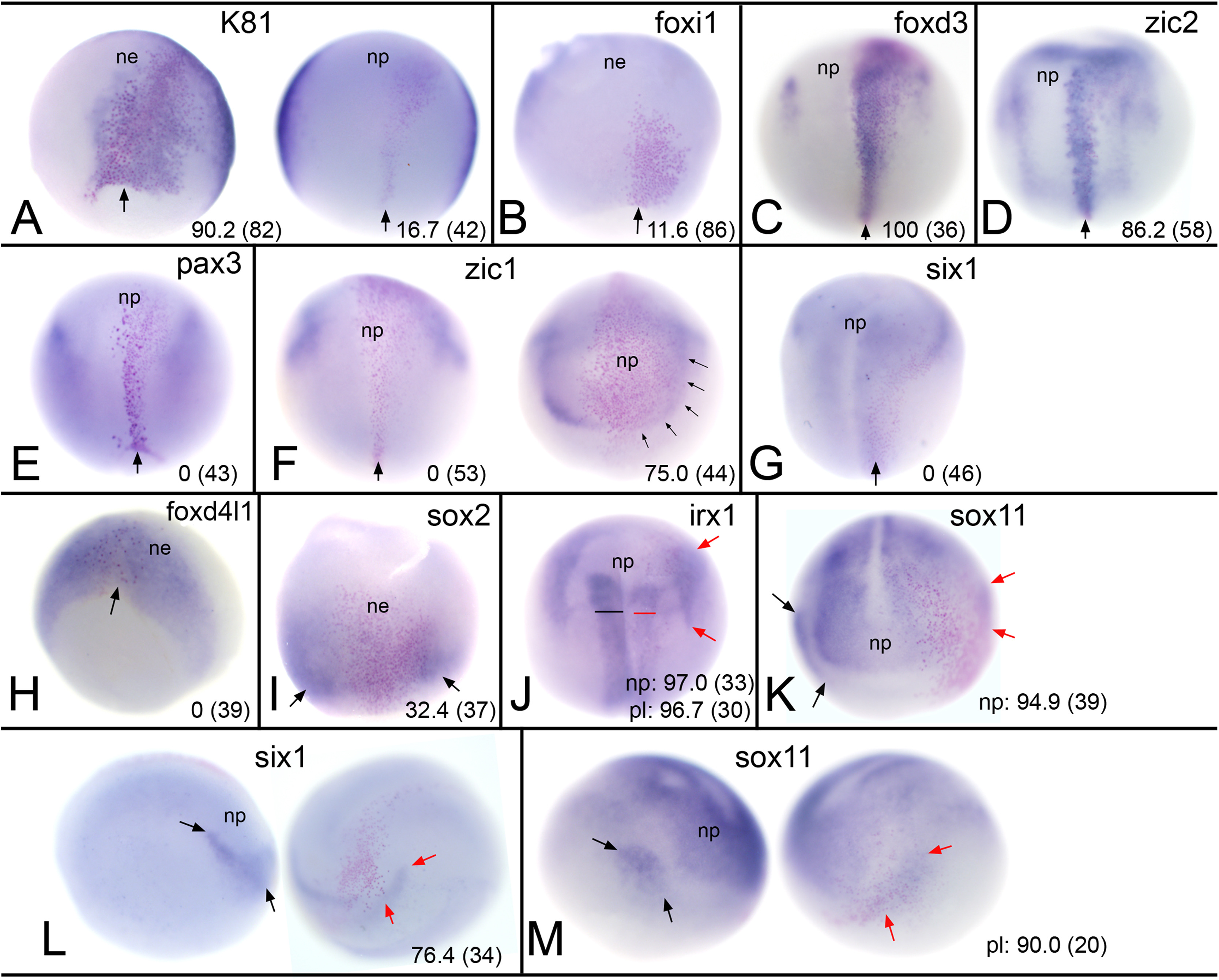 Fig. 3. Increasing Wbp2nl levels alters ectodermal gene expression. (A) Increased Wbp2nl causes ectopic expression of epidermal keratin (K81) in the neural ectoderm (ne) at gastrula stages (left) but not at neural plate (np) stages (right). Pink nuclei identify the cells that are expressing excess Wbp2nl and the black arrow indicated the posterior extent of the clone. A-D, dorsal views with animal to top. (B) Increased Wbp2nl does not induce ectopic foxi1 in the ne. (C) Increased Wbp2nl causes ectopic expression of foxd3 in the neural plate (np). (D) Increased Wbp2nl causes ectopic expression of zic2 in the neural plate. (E-G) Increased Wbp2nl does not cause ectopic neural plate expression of pax3, zic1 or six1 (dorsal views with animal to top). In fact, zic1 neural plate expression is reduced on the injected side (F, right image, anterior view, dorsal to top). (H) Increased Wbp2nl does not alter foxd4l1 neural ectoderm expression. Vegetal-dorsal view. (I) Neural ectoderm expression of sox2 in the gastrula is reduced compared to lateral regions (black arrows) that do not contain Wbp2nl-expressing cells (pink nuclei). Dorsal view, animal to top. (J) Both the neural plate (red bar) and placode (red arrows) domains of irx1 are reduced by increased Wbp2nl compared to control side (black bar). Dorsal view, anterior to top. (K) Both the neural plate and placode (red arrows) expression of sox11 are reduced by increased Wbp2nl. Anterior view, dorsal to top. (L) The placode (red arrows) domain of six1 is reduced by increased Wbp2nl, compared to control uninjected side (black arrows). Side views, dorsal to top. (M) The placode (red arrows) domain of sox11 is reduced by increased Wbp2nl compared to control uninjected side (black arrows). Note reduced neural plate (np) staining as well. Side views, dorsal to top. Frequencies of the phenotypes and sample sizes (n) are given in each panel. |
