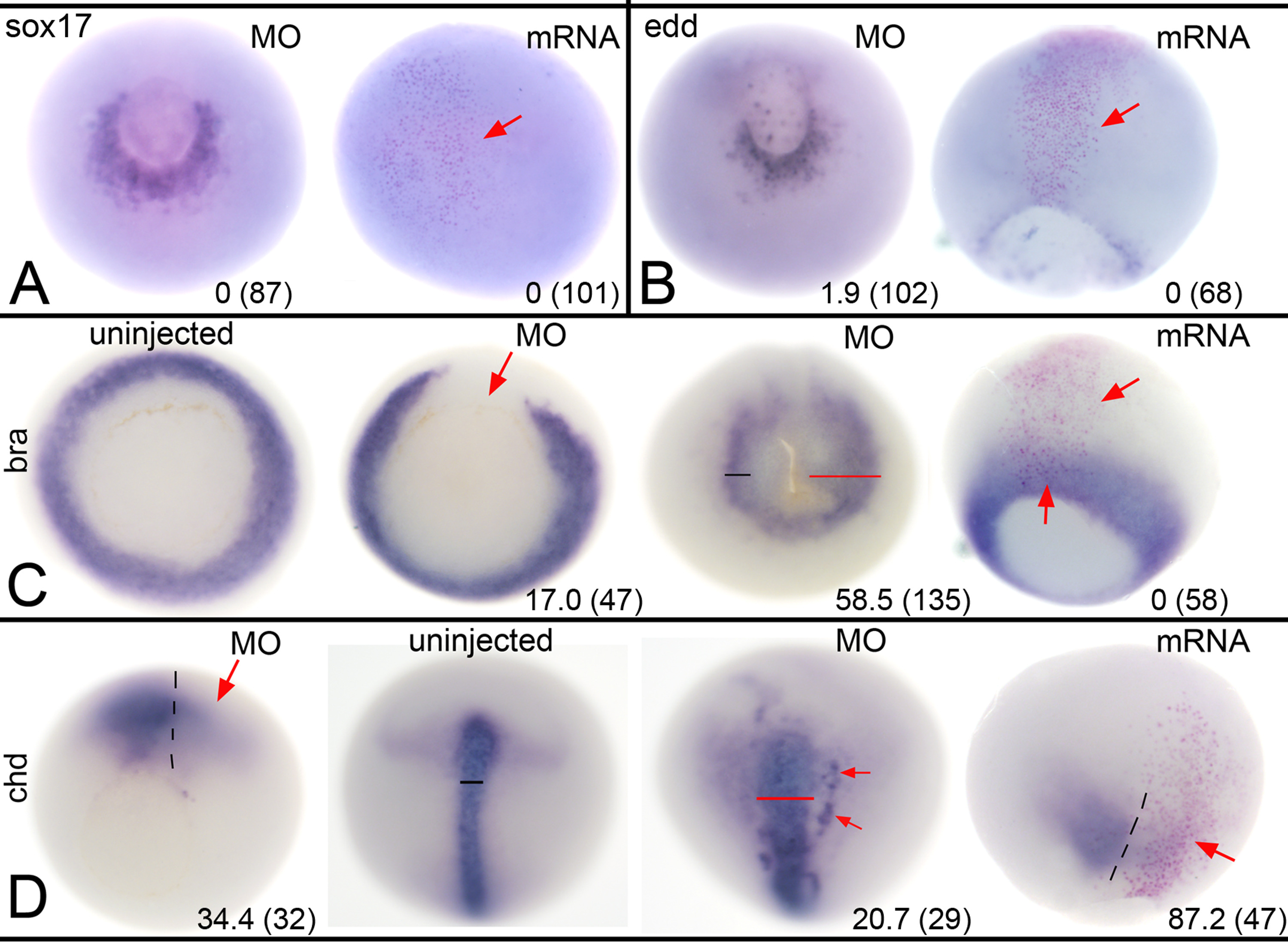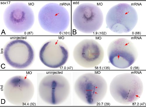 Fig. 4. Altered Wbp2nl levels affect mesoderm but not endoderm. (A) At gastrula stages, sox17 expression surrounding the ventral blastopore on the MO-injected side of an embryo (left image, vegetal view) is not discernably different from control side. Increased Wbp2nl in the animal pole ectoderm (right image, animal view; clone marked by pink nuclei and red arrow) does not ectopically induce sox17. (B) At gastrula stages, edd expression surrounding the ventral blastopore on the MO-injected side (left image, vegetal view) is not discernably different from control side. Increased Wbp2nl in the neural ectoderm (right image, dorsal view; clone marked by pink nuclei and red arrow) does not ectopically induce edd. (C) At gastrula stages, mesoderm expression of bra encircles the blastopore in uninjected control embryos (left image, vegetal view); knock-down of Wbp2nl causes a loss of bra expression (left middle image, vegetal view, red arrow). In contrast, at neural plate stages (right middle image, vegetal view), we detect a posterior expansion (red bar) of bra expression on the knock-down side. At gastrula stages, increased Wbp2nl (right image, dorsal view; clone marked by pink nuclei between red arrows) does not alter endogenous bra expression nor ectopically induce it. (D) At gastrula stages, mesoderm expression of chd is reduced by Wbp2nl knock-down (red arrow, left image, vegetal view; dashed line indicates dorsal midline). In contrast, at neural plate stages, chd is expanded (compare uninjected control pattern [left middle image] to MO-injected pattern [right middle image]; dorsal views with anterior to the top). Red bar shows a wider domain and red arrows denote ectopic expression. At gastrula stages, increased Wbp2nl (right image, dorsal view, anterior to top; dashed line indicates dorsal midline) also reduces endogenous chd expression (red arrow). Frequencies of the phenotypes and sample sizes (n) are given in each panel. |