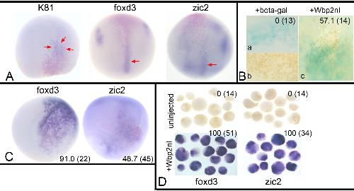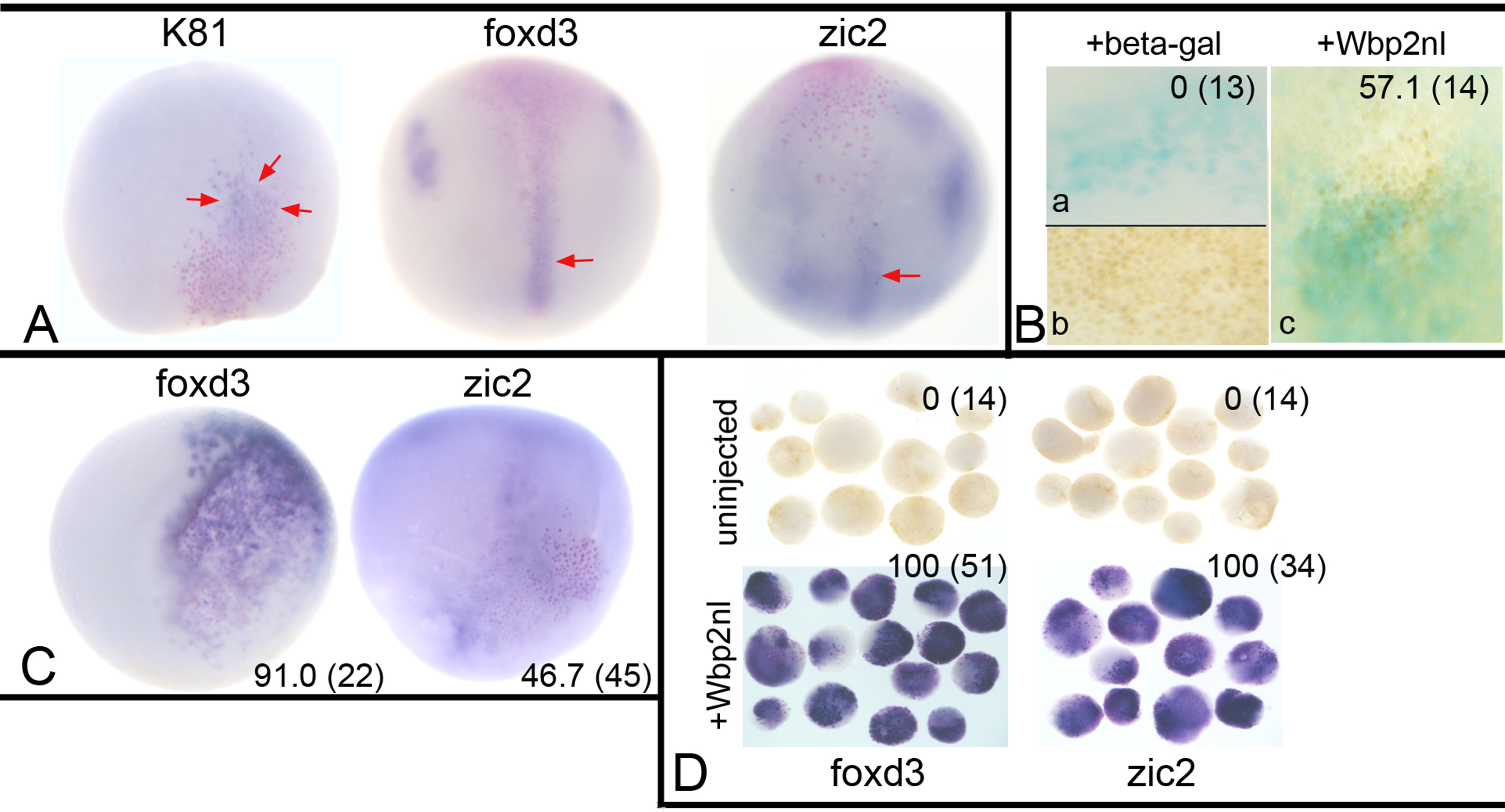Fig. 5. BMP signaling underlies Wbp2nl-induced ectopic expression phenotypes. (A) The ectopic expression of K81, foxd3 and zic2 are minimized by co-expression of Chd, a BMP antagonist. Red arrows point to weak posterior ectopic gene expression observed in those few embryos that were positively scored. (B) Immunostaining for phosphorylated SMAD 1/5/8, an indicator of BMP signaling when located in the nucleus. Only embryos in which ventral cells, which are subject to high levels of endogenous BMP signaling, showed nuclear staining were analyzed (b). No embryo injected only with lineage tracer (blue) showed nuclear staining in the neural plate (a), whereas a majority of embryos injected with lineage tracer plus wbp2nl mRNA showed nuclear staining (c). (C) Expression of Wbp2nl in the ventral epidermis causes ectopic expression of two neural crest genes (foxd3, zic2). Pink nuclei (lineage tracer) indicate the Wbp2nl containing cells. Ventral views, anterior to the top. (D) Ventral animal blastomeres were dissected from the 16-cell stage embryo and cultured in simple salt medium. Those dissected from uninjected control embryos never expressed foxd3 or zic2, whereas those that express Wbp2nl (red nuclei) always expressed these genes. Frequencies of the phenotypes and sample sizes (n) are given in each panel. |