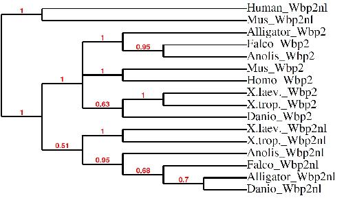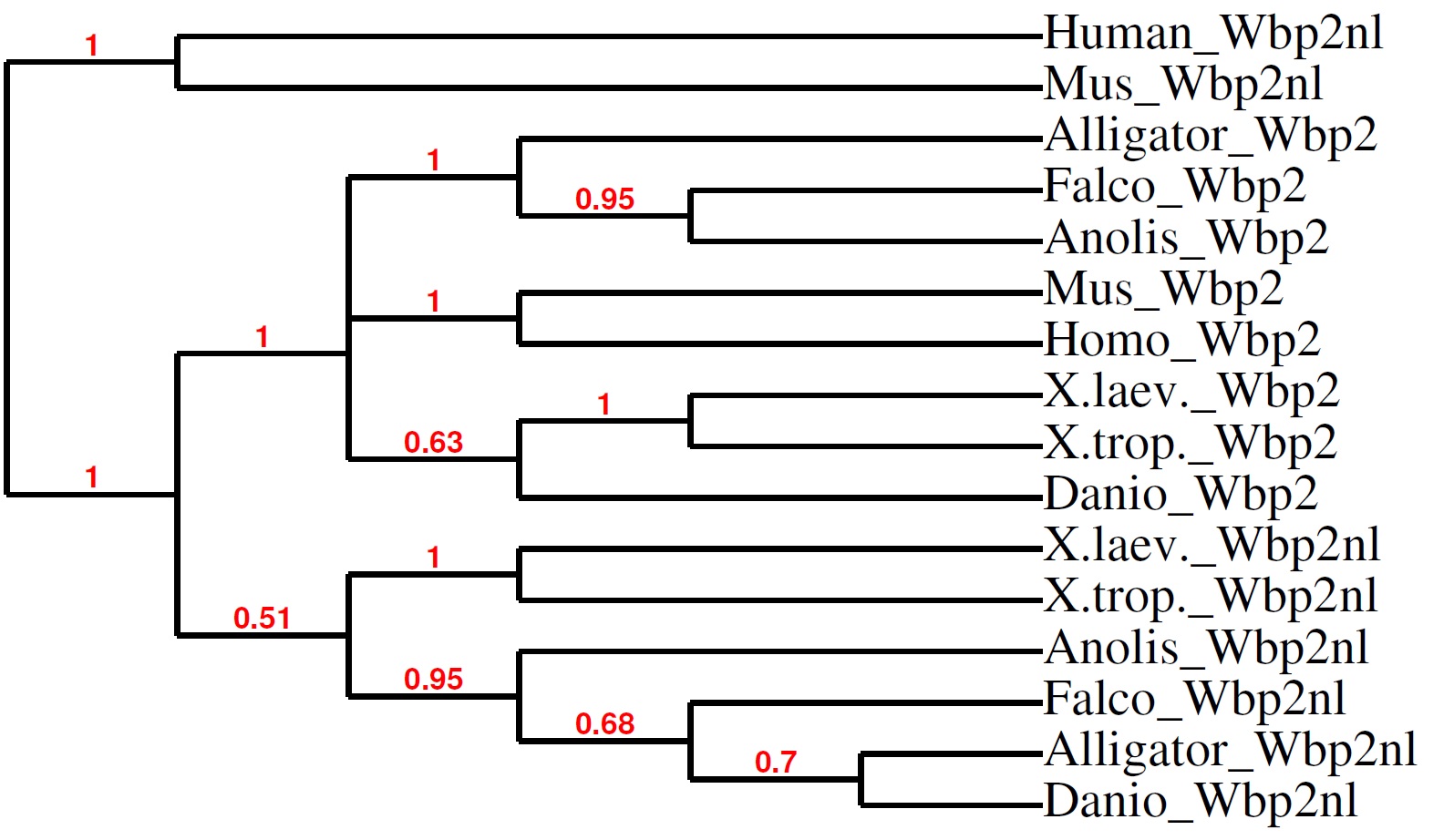 Supplementary material Supplemental Fig. 1: Phylogenetic Tree for Wbp2 and Wbp2nl orthologues. Tree analysis shows that the Wbp/Wbp2nl proteins separate into two clades across several vertebrate taxa (Homo = human; mus = mouse; anolis and alligator = reptiles; Falco = falcon (bird); Danio = zebrafish; X. Laev and X. trop = amphibian). Mammalian WBP2NL (human, mouse) do not tightly cluster with the homologous proteins of the other vertebrates. Numbers on branches are Bootstrap Values. Protein identifiers are: Human_Wbp2nl - AAH22546.1, Mus_Wbp2nl - NP_083342.1, Alligator_Wbp2 - XP_014372734.1, Falco_Wbp2 - XP_014142228.1, Anolis_Wbp2 - XP_014142228.1, Mus_Wbp2 - AAH55058.1, Homo_Wbp2 - AAH10616.1, X.laev._Wbp2 - NP_001083140.1, X.trop._Wbp2 - AAH88817.1, Danio_Wbp2 - AAH95106.1, X.laev._Wbp2nl - NP_001088037.1, X.trop._Wbp2nl = NP_001107397.1, Anolis_Wbp2nl - XP_008108972.1, Falco_Wbp2nl - XP_014137125.1, Alligator_Wbp2nl - XP_006027702.1, Danio_Wbp2nl - NP_956004.1. |