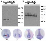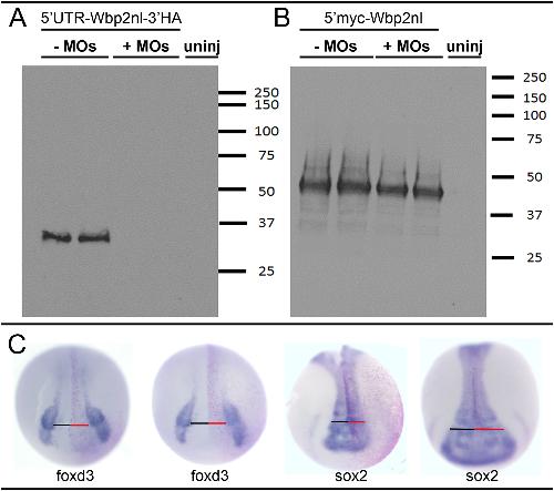Fig. S3. Wbp2nl MOs are effective and specific. (A) wbp2nl mRNA consisting of the endogenous 5â²UTR and ORF followed by a 3â² HA tag is abundantly expressed in the absence of MO#1 + MO#2 (left two lanes), but is not detected in the presence of the MOs (middle two lanes). Uninj = lysate from uninjected oocytes. (B) the rescue wbp2nl mRNA, consisting of 6 copies of the myc epitope in-frame with the wbp2nl ORF is abundantly expressed in both absence (left two lanes) and presence (middle two lanes) of MO#1 + MO#2. See Supplemental Fig. 1 for sequence of this ârescueâ mRNA. (C) Left: Two examples of the rescue of the diminished foxd3 domain and expanded neural plate domain (red and black bars) after co-expression of an MO-resistant wbp2nl mRNA (rescue) with the Wbp2nl MOs (10/10 embryos showed rescue). Right: Two examples of the rescue of the expanded sox2 neural plate domain after co-expression of an MO-resistant wbp2nl mRNA (rescue) with the Wbp2nl MOs (11/15 embryos showed rescue). |