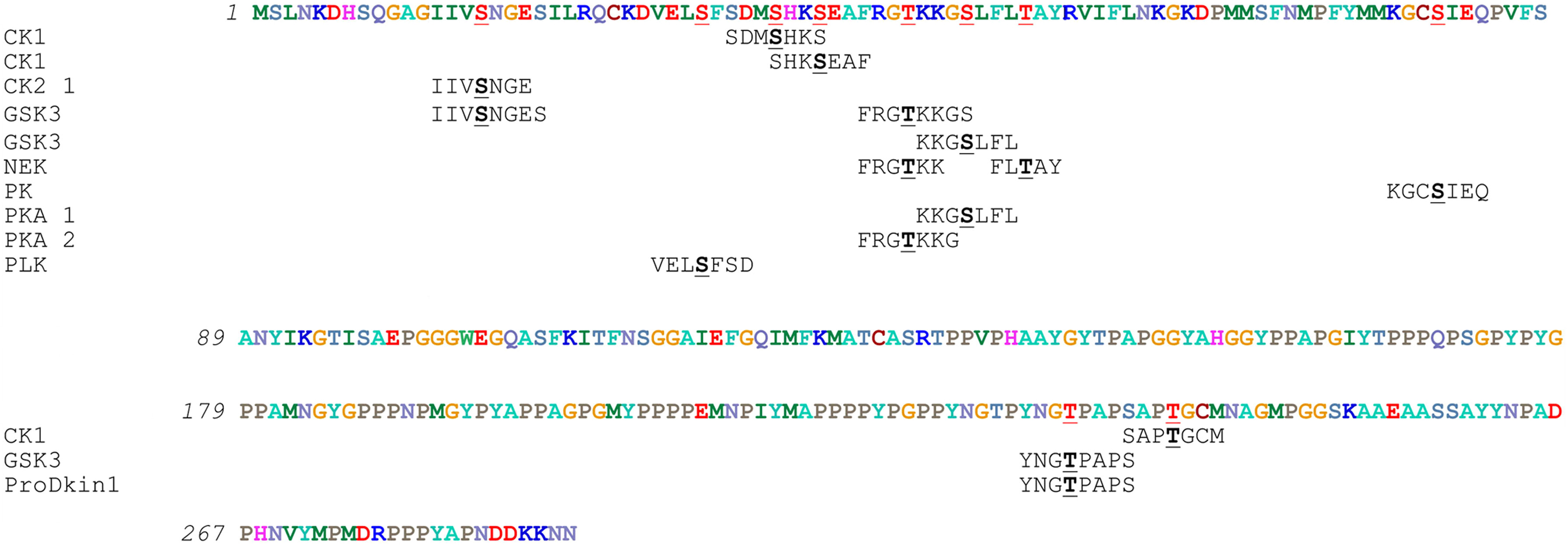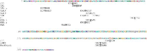 Fig. S4. Xenopus Wbp2nl (colored amino acids) contains several predicted sites of phosphorylation (underlined) many of which are contained within motifs (black letters with phosphorylation site in bold) characteristic of a number of kinases (listed on left margin). |