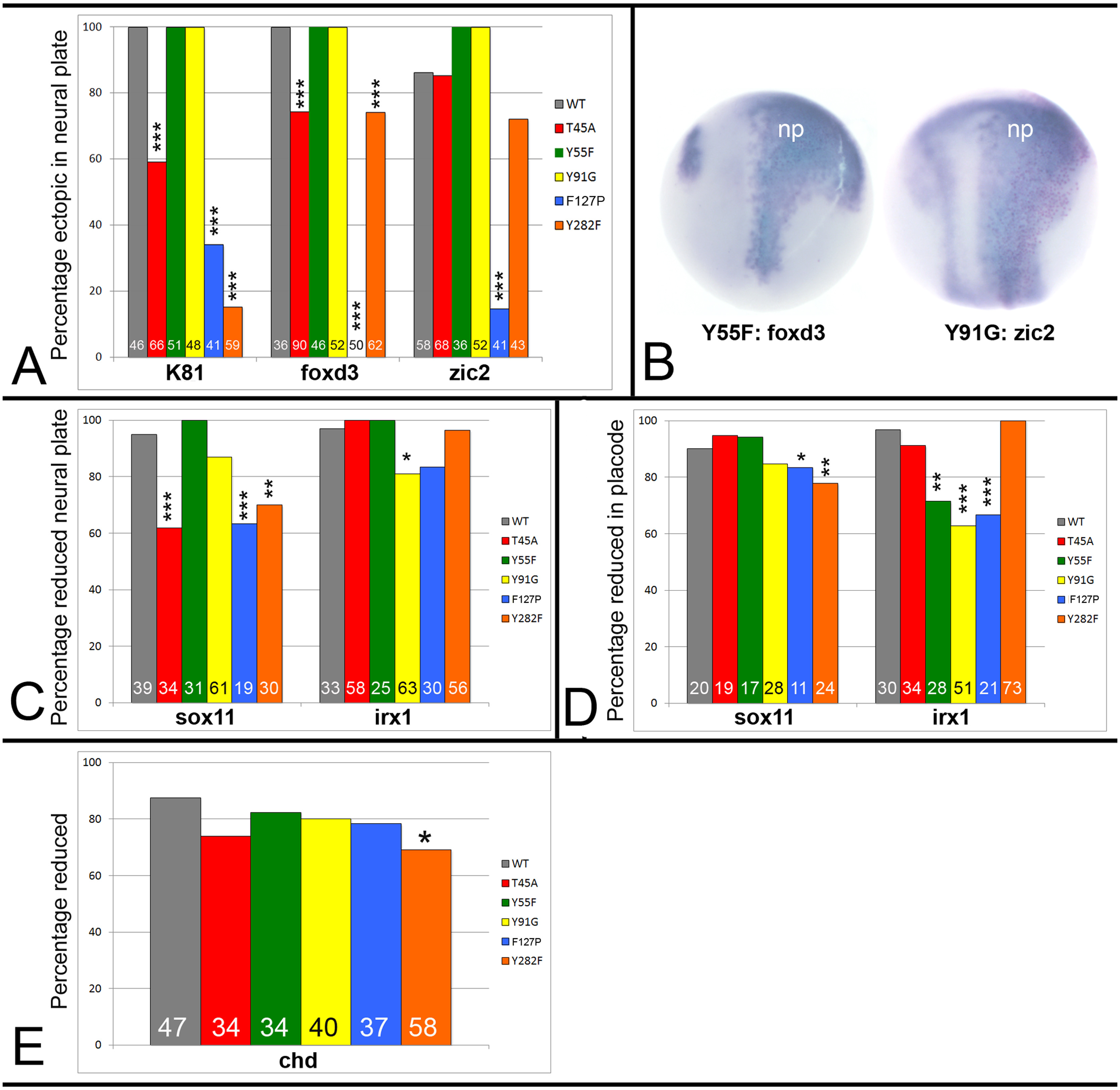 Fig. 6. Mutations in predicted functional domains of Wbp2nl, indicated in Fig. 1A, affect its ability to change embryonic gene expression. (A) Percentages of embryos that show ectopic neural plate expression of indicated genes after injection of wild type (WT) or mutated mRNAs: T45A, Y55F and Y91G disrupt putative phosphorylation sites in the PH-G domain; F127P disrupts an α-helix in the PH-G domain; Y282F disrupts a putative YAP binding site at the C-terminus (see Fig. 1A). Sample sizes are numbers at the base of each bar. *, p < 0.05; **, p < 0.01; ***, p < 0.005, Chi-squared statistic. (B) Two examples of more intense and broader ectopic expression domains of foxd3 or zic2 in the neural plate (np) after expression of two mutant proteins (Y55F; Y91G). Compare to WT images (Fig. 3C, D). Dorsal views, anterior to the top. (C) Percentages of embryos that show reduced neural plate expression of indicated genes after expression of wild type (WT) or mutated proteins. (D) Percentages of embryos that show reduced placode expression of indicated genes after expression of wild type (WT) or mutated proteins. (E) Percentages of embryos that show reduced chd expression after expression of wild type (WT) or mutated proteins. |