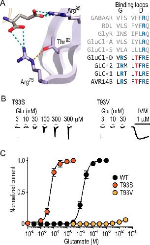 A, magnified view of GLC-1 crystal structure illustrating proximity of Thr93 hydroxyl oxygen to Arg76 ϵ nitrogen (2.9 Å; orange dashed line; numbers refer to equivalent residues in AVR-14B). Dashed lines indicate inter-atomic distances ≤3.5 Å. Amino acid sequence alignment shows selected Loop G and Loop D residues from ecdysozoan GluCls (dark font), lophotrochozoan GluCls and vertebrate and invertebrate GABA and glycine receptors (light font). B, example recordings of glutamate (Glu) and ivermectin (IVM) responses at oocytes expressing mutant AVR-14B GluCls (scale bars: x, 5 s; y, 2 μA). C, mean ± S.E. (n = 6–8) peak current responses to increasing concentrations of glutamate, normalized to maximum glutamate-gated current (WT and T93S) or maximum IVM-gated current (T93V).