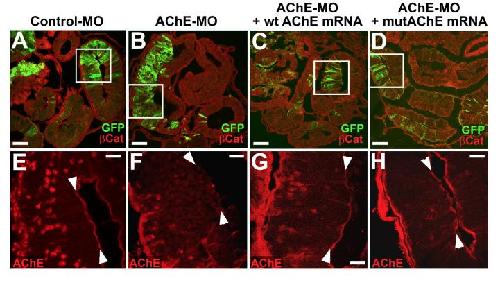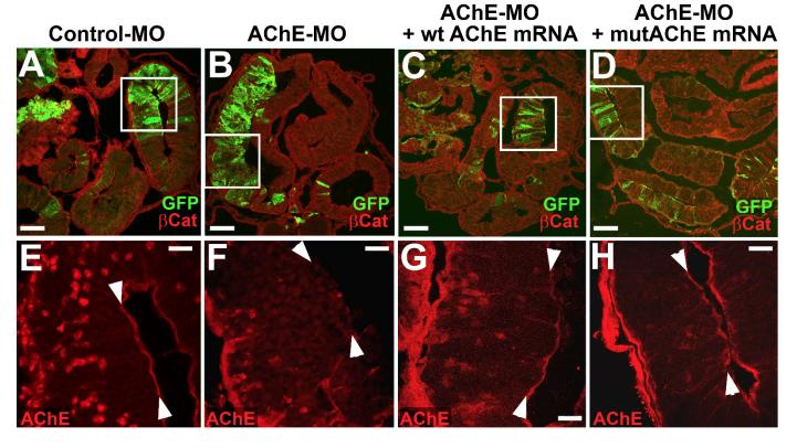 Figure S1) Morpholino-mediated knockdown of AChE protein expression. In sections through the intestine of NF 46 embryos injected with control MO (A), AChE MO (B), AChE MO + wt AChE mRNA (C), or AChE MO + mutAChE mRNA (D), β-catenin (red) outlines membranes of injected (i.e., GFP labeled; green) and uninjected cells. Serial sections from embryos in A-D were immunostained for AChE (red) and images of the boxed regions are shown at higher magnification (E-H). Apical localization of AChE protein (indicated by arrowheads in E-H) is observed in control MO injected cells (E), but is missing in AChE MO injected epithelium (F). AChE staining is rescued by co-injection with either wt AChE mRNA (G) or mutAChE mRNA (H). Scale bars = 100 μm (A-D); 25 μm (E-H). |