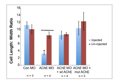 Figure S4) Quantification of the effect of AChE on endoderm cell shape. Length and width measurements were taken for at least 5 endoderm cells in each Control (Con) MO or AChE MO-injected embryo (+/- wt AChE or mutAChE mRNA) and the average L:W ratio calculated. Graphs represent mean L:W ratio for at least three embryos in each injection group ±S.E.M (n = number of individual embryos used to measure L:W ratios). Significant differences among injected cells are indicated by * (p<0.05). Significant differences between injected and un-injected cells within microinjection groups are indicated by a bar (p<0.05). |