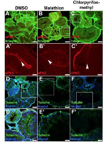 Figure S5) Chemical AChE inhibitors alter endoderm polarity, rearrangement and microtubule architecture. Transverse cross-sections through the gut of NF 46 tadpoles exposed to DMSO (A, Aâ, D, Dâ), Malathion (B, Bâ, E, Eâ), or Chlorpyrifos-methyl (C, Câ, F, Fâ) from NF 33-46 were stained with integrin (A-C; green) to outline endoderm cell membranes, aPKC (A-Câ; red) to highlight the apical surface of the epithelium, and alpha-tubulin (D-Fâ; green) to visualize microtubules. Compared with the columnar epithelium in DMSO exposed controls (A), the organization is disrupted in AChE inhibitor treated embryos (B, C). Arrowheads highlight robust apical expression of aPKC in DMSO controls (Aâ), versus patchy aPKC expression in chemically inhibited embryos (Bâ, Câ). Likewise, in DMSO controls (D, Dâ), α-tubulin bundles (green) are normally aligned along the apicobasal axis of the endoderm cells, with slight apical enrichment (D,Dâ); however, exposure to Malathion (E,Eâ) or Chlorpyrifos-methyl (F,Fâ) disrupts this architecture. Higher magnification images of the boxed regions in A-F are shown in Aâ-Fâ. Scale bars in A-C, D-F= 100 um. Scale bars in Dâ-Fâ= 50 um. Scale bars in Aâ-Câ = 25 um. |