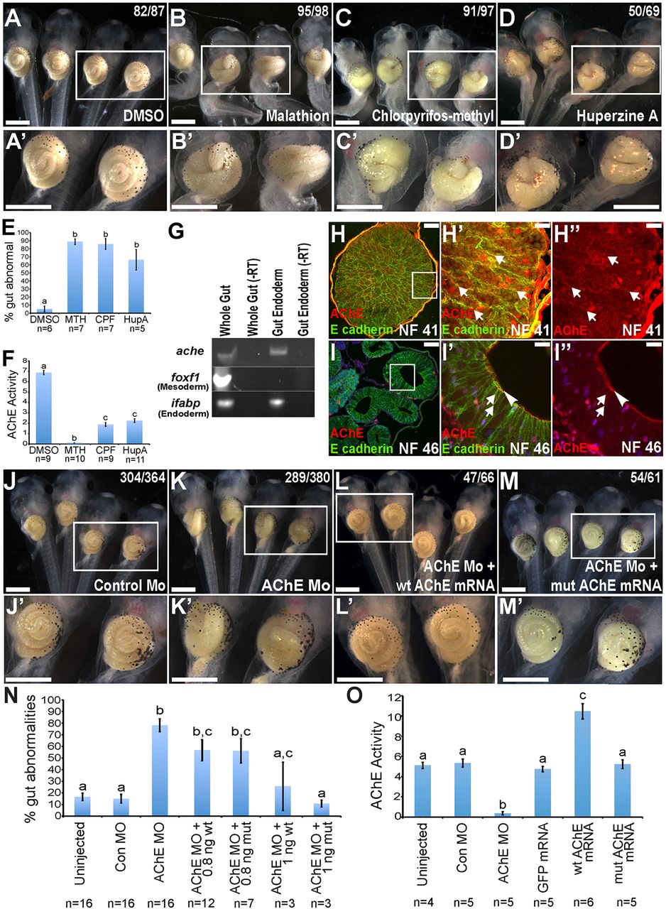 Fig. 1. AChE plays a non-neuronal, non-esterase role in intestine organogenesis. Normal intestinal elongation and rotation are observed in DMSO-exposed control tadpoles (A,Aâ²). Exposure to malathion (MTH; B,Bâ²), chlorpyrifos-methyl (CPF; C,Câ²) or Huperzine A (HupA; D,Dâ²) increases the percentage (E) of tadpoles with short/malrotated intestines. AChE activity assays (F) confirm that the applied compounds inhibit AChE in vivo. RT-PCR (G) indicates that isolated intestinal endoderm (indicated by the expression of ifabp, but not foxf1) expresses ache. âRT, control lacking reverse transcriptase. At NF 41, AChE (red) colocalizes with E-cadherin (green) at endoderm cell membranes (H-Hâ², arrows). By NF 46, AChE is apically enriched (I-Iâ², arrowheads), with reduced lateral membrane expression (arrows). Intestinal development is normal in control MO-injected embryos (J,Jâ²,N), whereas microinjection of AChE MO results in short/malrotated intestines (K,Kâ²,N). Intestinal malformations are rescued by co-injection of RNA encoding wt AChE (L,Lâ²,N) or mutAChE that lacks catalytic activity (M,Mâ²,N). AChE activity assays (O) confirm that AChE MO knocks down AChE, that wt AChE mRNA increases activity, and that mutAChE mRNA has no effect on AChE activity, relative to controls (uninjected, control MO, GFP mRNA). Higher magnification views of the boxed regions in A-D,H-M are shown in Aâ²-Dâ²,Hâ²-Mâ², respectively. The number of tadpoles with the phenotype shown among the total number of tadpoles in that experimental group is indicated (A-D,J-M). Bar charts show mean±s.e.m. Significant differences between the percentage of tadpoles with abnormal gut phenotypes or between AChE activities from n=3-16 independent experiments (16-30 embryos per condition per experiment) are indicated by lowercase letters (P<0.05). Scale bars: 1000â μm in A-Dâ²,J-Mâ²; 100â μm in H,I; 25â μm in Hâ²-Iâ². |