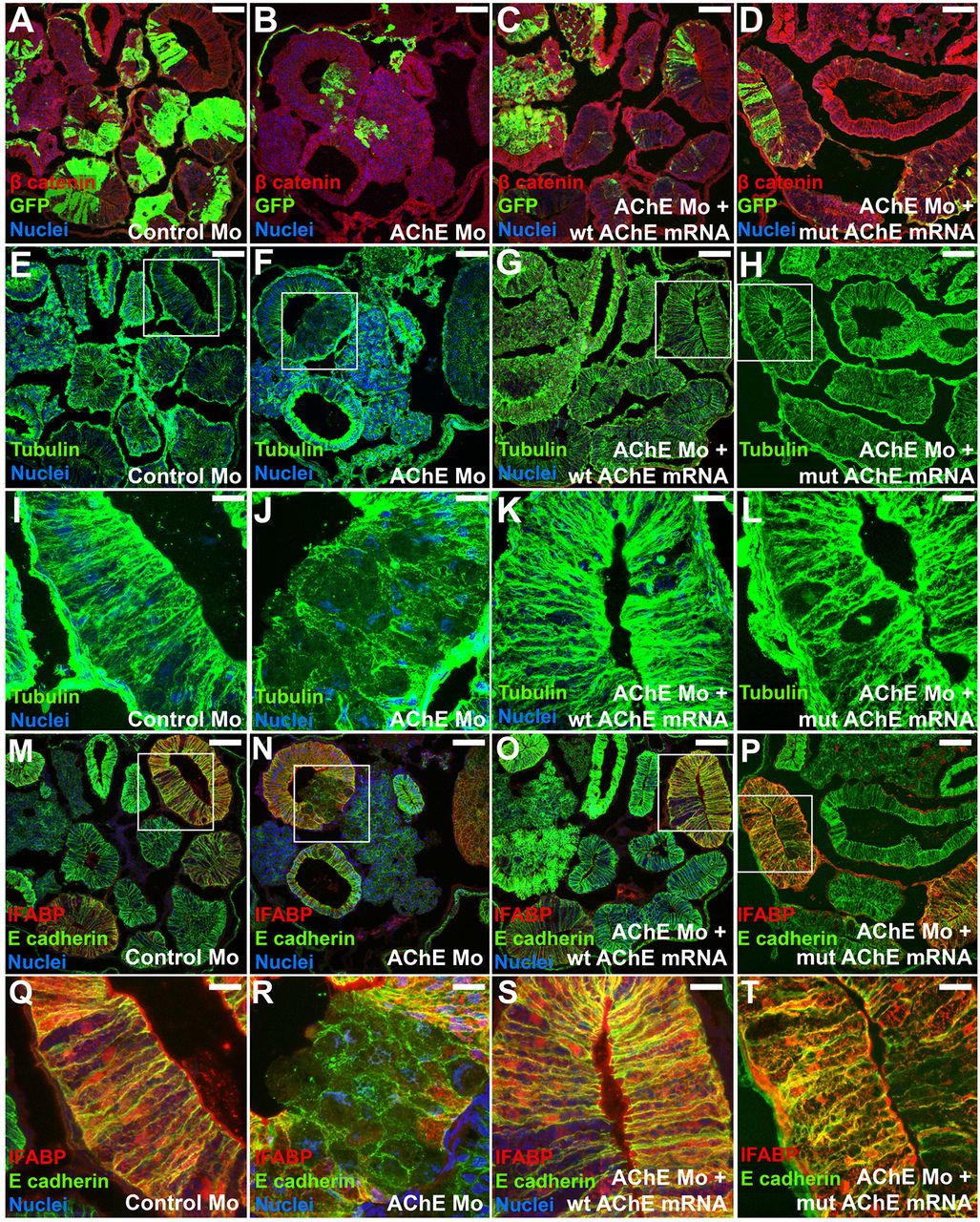 Fig. 3. AChE is required for microtubule organization and endoderm differentiation. In NF 46 intestine sections of embryos injected with control MO (A), AChE MO (B), AChE MO plus wt AChE mRNA (C), or AChE MO plus mutAChE mRNA (D), β-catenin (red) outlines cell membranes of injected (GFP labeled, green) and uninjected cells. Serial sections from embryos in A-D were immunostained to visualize microtubules (α-tubulin, green) (E-H); boxed regions are shown at higher magnification in I-L. Microtubules are apically enriched and oriented along the apical-basal axis of columnar epithelial cells (I). Microtubule organization is disrupted when AChE is knocked down (J), but is rescued by co-injection of the AChE MO with wt AChE mRNA (K) or mutAChE mRNA (L). Serial sections from embryos in A-H were immunostained for E-cadherin (green) and IFABP (red) (M-P); boxed regions are shown at higher magnification in Q-T. IFABP is expressed in control MO-injected intestine (Q). AChE knockdown (R) prevents differentiation of the endoderm, as indicated by the absence of IFABP in AChE MO-injected cells. Differentiation is restored by co-injection of the AChE MO with wt AChE mRNA (S) or mutAChE mRNA (T). Nuclei, blue (TO-PRO-3). Scale bars: 100â μm in A-H,M-P; 25â μm in I-L,Q-T. |
