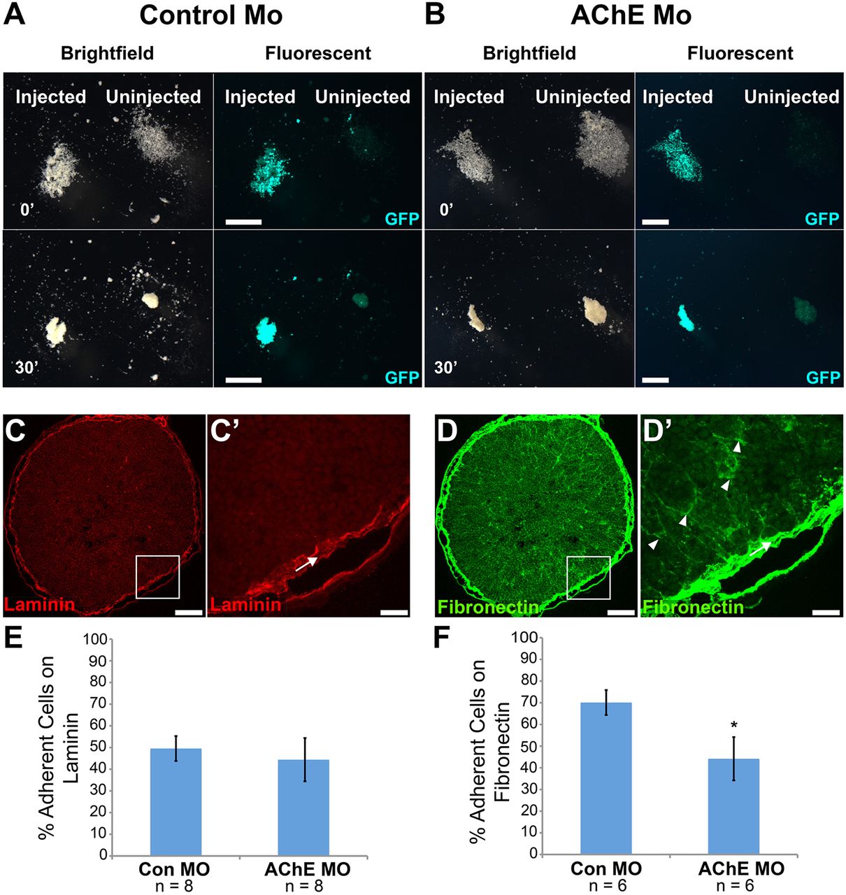 Fig. 4. AChE is not required for cell-cell adhesion, but is necessary for cell-substrate adhesion to fibronectin. Dissociated intestinal endoderm cells from control MO-injected (A) or AChE MO-injected (B) embryos reaggregated 30â min (30â²) after introduction of Ca2+ ions into the medium (0â²; see supplementary Materials and Methods). Brightfield/fluorescent images show that both injected and uninjected cells from each injection group reaggregated. Assays were performed using at least three different embryos per condition. Transverse sections through wild-type guts (NF 41) were immunostained for laminin (LM; C,Câ²) or fibronectin (FN; D,Dâ²). LM (red) is found at basement membranes (arrow) surrounding the gut tube. FN (green) is found at the basement membrane (arrow), but is also enriched at endoderm cell basal poles (arrowheads). Endoderm cells from control MO-injected or AChE MO-injected intestines were plated on LM (E) or FN (F). There is no difference in cell adhesion on LM (E), but cells from AChE MO-injected embryos are less adherent than control cells on FN (F). Mean±s.e.m. for the percentage of adherent cells for six to eight independent embryos. *P<0.05. Scale bars: 1000â μm in A,B; 100â μm in C,D; 25â μm in Câ²,Dâ². |