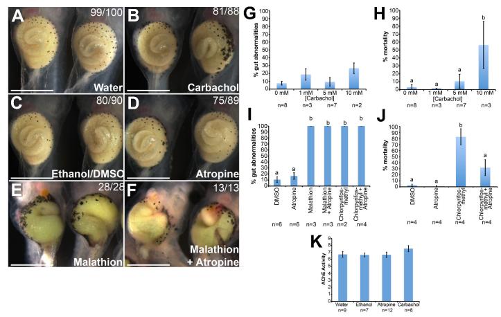 Figure S3) Modulation of cholinergic signaling via acetylcholine receptors (AChR) does not affect gut morphogenesis. Exposure of X. laevis tadpoles to the AChR agonist carbachol (B) from NF 33-46 does not affect elongation or rotation of the gut relative to water solvent controls (A). Similarly, exposure to the AChR antagonist atropine (D) has no impact on gut morphogenesis relative to DMSO/ethanol treated solvent controls (C). Gut elongation defects observed in AChE-inhibited embryos (e.g., Malathion; E) are not rescued by simultaneously blocking cholinergic signaling with atropine (F). Higher concentrations of carbachol do not affect intestinal development (G), but do result in a significant increase in embryonic lethality (H). Atropine does not rescue intestinal development in AChE inhibited embryos (I), but does reduce Chlorpyrifos-methyl (10mg/L) induced embryonic lethality (J). Neither atropine nor carbachol significantly alter AChE enzymatic activity (K). Scale bars = 1000 um. |