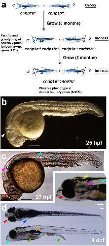 Figure 3. Mutagenesis of cnrip1a and cnrip1b. (a) Alignments of wild type with each of three mutant alleles showing the predicted expressed mutant polypeptide beneath. Bold underline indicates the gRNA target, red font the protospacer motif recognised by Cas9, hyphens deleted bases, blue highlight inserted bases and asterisks novel stop codons. In the mutant protein sequences, bold text indicates the residual wild type fragment and normal font the aberrant polypeptide tail. (b,c). To test for nonsense-mediated decay, about 50 siblings from in-crosses of cnrip1a