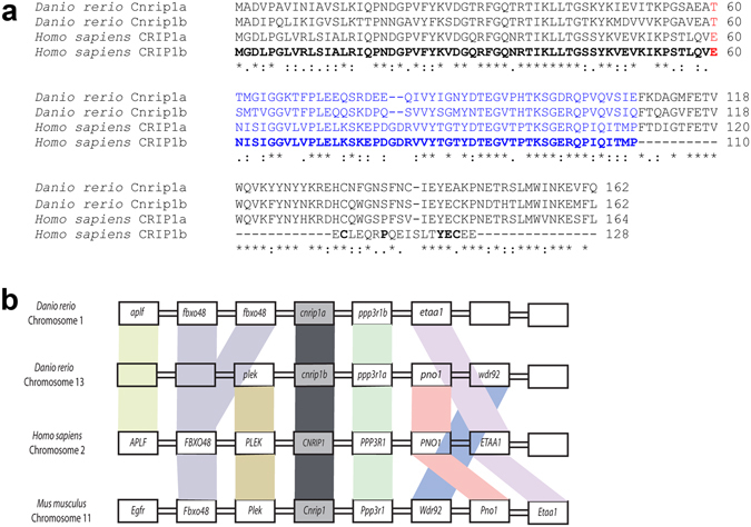 Figure 1. Cnrip1 genes in zebrafish. (a) Amino acid sequence alignment of Cnrip1a and Cnrip1b with the two splice variants of the single human CNRIP1 gene, named CRIP1a and CRIP1b. Distinct exons are shown in alternating black and blue font (red indicates amino acids coded by two exons). Comparing both zebrafish genes and CRIP1a asterisk indicates identity and colon similarity between all three, full stop similarity between any two. Bold indicates identity between CRIP1a and CRIP1b. (b) Synteny of adjacent genes in vertebrate CNRIP1 loci. Colours link homologous genes.