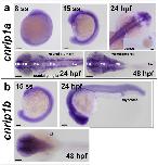 Figure 2. Accumulation of mRNAs from cnrip1a and cnrip1b genes. Whole mount in situ mRNA hybridisation of embryos at the indicated stages for antisense probes to cnrip1a (a) and cnrip1b (b). Lateral views (first two images in each panel) are anterior to top dorsal to left, except 24 hpf in which anterior is to left and dorsal to top. Dorsal views (remaining images) are anterior to left flatmounts (a) or wholemount (b), except panel a top right, which is a wholemount montage with anterior to top right. Sense control in inset in panel a top right is anterior to right dorsal to bottom. Quantitative evidence of reproducibility is given in Table S1. tel telencephalon, FB forebrain, MB midbrain, HB hindbrain, SC spinal cord, pf pectoral fin. Bars = 100 µm.