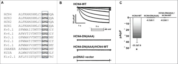 Figure 2. HCN4 dominant-negative effect test in HEK293 cells. (A) Sequence alignment of mouse HCN channels and other K+ channel examples that have a signature cation selectivity “GYG” motif at the channel pore region. (B) IHCN currents were elicited by a stepwise hyperpolarization to −120 mV from a holding potential of −40 mV; and then normalized to membrane capacitance. Representative IHCN4 current traces recorded in HEK293 cells expressing HCN4-WT, HCN4-DN(AAA) mutant, both HCN4-DN(AAA)/HCN4-WT, or a vector control are shown. Transfection with HCN4-WT produced robust IHCN4 currents, whereas transfection with HCN4-DN(AAA) did not produce any current greater than the vector control. When HCN4-WT and HCN4-DN(AAA) were co-transfected, IHCN4 was abolished. (C) Summary data for the peak IHCN4 currents recorded from HEK293 cells expressing WT-HCN4, HCN4-AAA mutant, HCN4-AAA/WT-HCN4 or vector control, confirming the ability of HCN4-DN(AAA) to act as a dominant-negative construct. n = 4–5, *p < 0.05. |