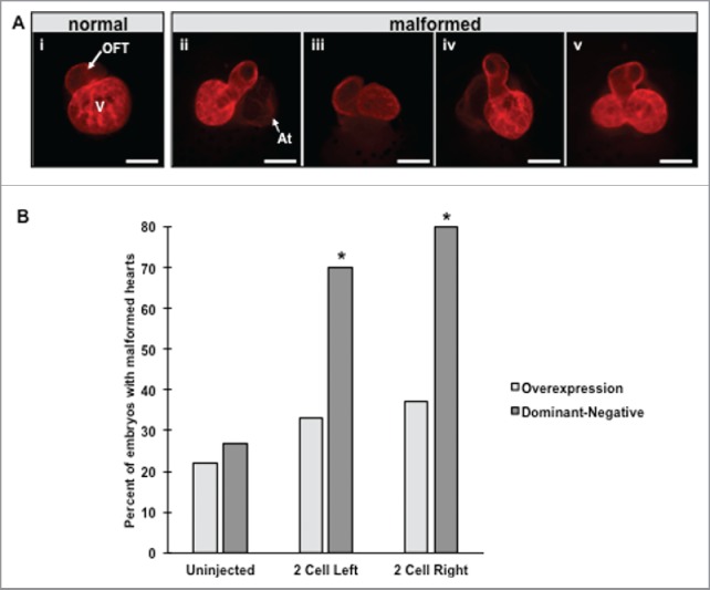 Figure 3. Overexpression and injection of dominant-negative HCN4 mRNA induces aberrant heart morphology. (A) Mature NF stage 46 tadpole hearts were visualized by immunohistochemistry using a cardiac troponin-T antibody to detect mature cardiac muscle. In control tadpoles, the ventricle (V) and outflow tract (OFT) are readily visible with the atria located directly behind the ventricle (i). Altering HCN4 expression induced a variety of morphological defects including hearts that were twisted into the dorso-ventral (D-V) body axis (ii), hearts rotated in the same plane of the D-V axis (iii), unlooped hearts (iv), and double ventricle phenotypes (v). In twisted hearts (ii) the atria are no longer positioned behind the ventricle and can now be seen (At = atria). (B) Both injection conditions of the HCN4-DN(AAA) construct induced significantly higher percentages of morphological defects compared with uninjected tadpoles, whereas overexpression of HCN4 did not cause significant occurrences of malformed hearts Ï2 = 58.174, df = 4, * p < 0.05; n = 75 embryos per condition across 3 biological replicates. |
