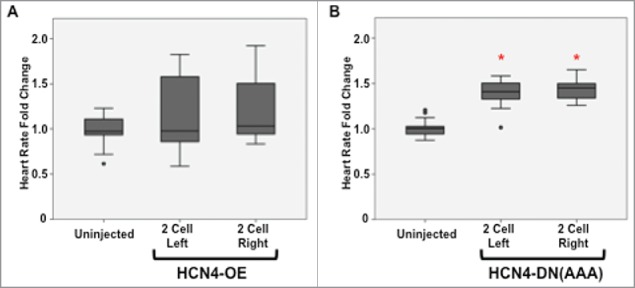 Figure 5. Injection of HCN4-DN(AAA) results in altered cardiac function. (A) Injecting wild-type HCN4 (HCN4-OE) into 2-cell embryos did not significantly alter heart rate. (B) Inhibiting HCN4 ion channel function (HCN4-DN[AAA]) resulted in significantly higher heart rates in all injection conditions (Welch's test, *p < 0.05). Dots represent outlier individuals who were greater or less than 1.5 times the upper and lower quartiles respectively. n = 30 embryos per condition across 3 biological replicates. |