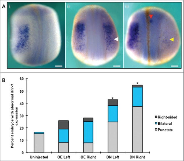 Figure 6. HCN4 helps coordinate the distribution of Xenopus nodal-related 1 (Xnr-1) expression. (A) During normal development, Xnr-1 is expressed exclusively in the left lateral plate mesoderm following the completion of neurulation as seen via in situ hybridization (NF stage 21, i). Both overexpression and injection of HCN4-DN(AAA) resulted in bilateral expression of Xnr-1, with the secondary Xnr-1 field ranging from a small partial field containing few cells (yellow arrow, iii) to an equivalent right-sided field (white arrow, ii). In addition to generating a second field of Xnr-1, punctate dots of expression were observed along the fused neural tube (iii, red arrow) and flanks of embryos. These ectopic dots were found on both sides of embryos regardless of the presence of endogenous Xnr-1 expression. Dorsal views, anterior at top. (B) While abnormal (bilateral, punctate, and right-sided reversed) expression was observed in all injection conditions, only HCN4-DN(AAA) injection caused a significant increase in abnormal phenotypes compared with uninjected embryos (Ï2 = 31.0207, df = 4, *p < 0.05). n = 73â84 per condition across 3 biological replicates. OE = HCN4-OE, DN = HCN4-DN(AAA). Scale bars = 200 μm. |